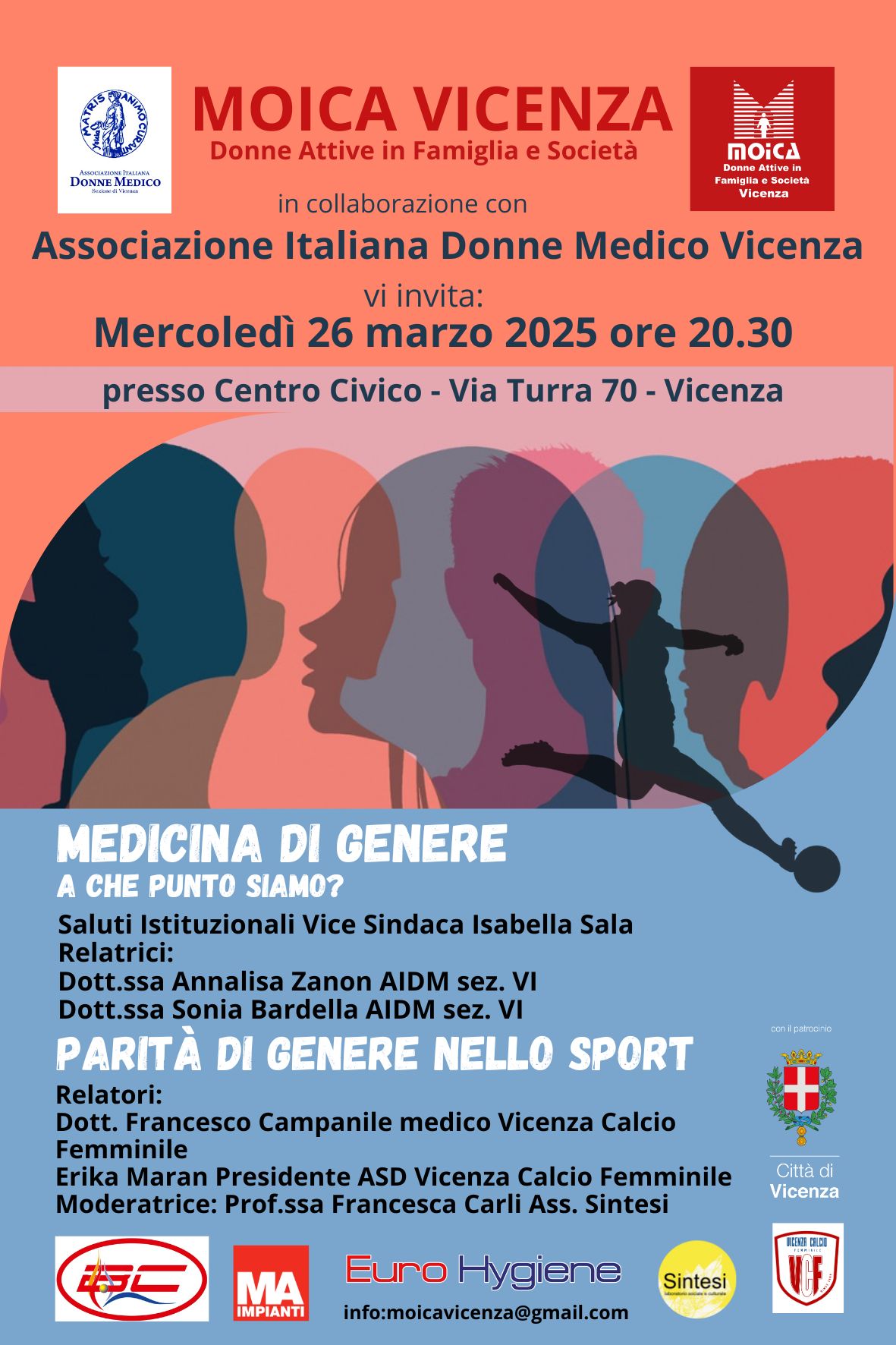 Dopo il Convegno del 20 marzo a Roma, sulla Medicina di Genere, nell'incontro si farà il punto della situazione e si esaminerà, con la Dott.ssa Annalisa Zanon e la Dott.ssa Sonia Bardella, quali passi avanti sono stati fatti. Parità di Genere nello Sport, interverrà la Presidente del Vicenza Calcio Femminile, Erika Maran e il Dott. Francesco Campanile medico sportivo VCF.