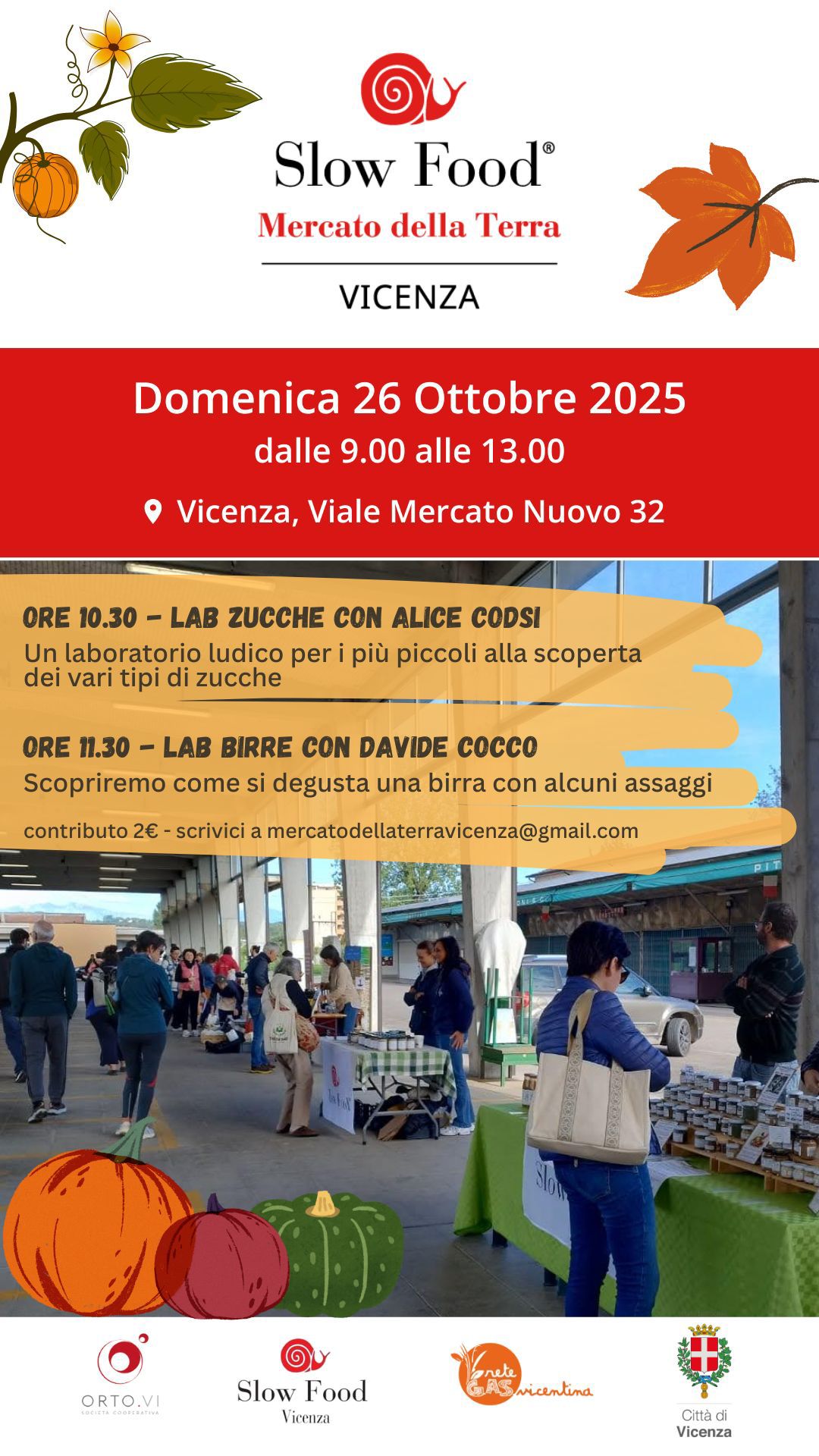 Il MERCATO DELLA TERRA, in collaborazione con Slow Food Vicenza e OrtoVi, è presente ogni ultima domenica del mese all'interno degli spazi del Mercato Ortofrutticolo in viale del Mercato Nuovo 32 a Vicenza.
