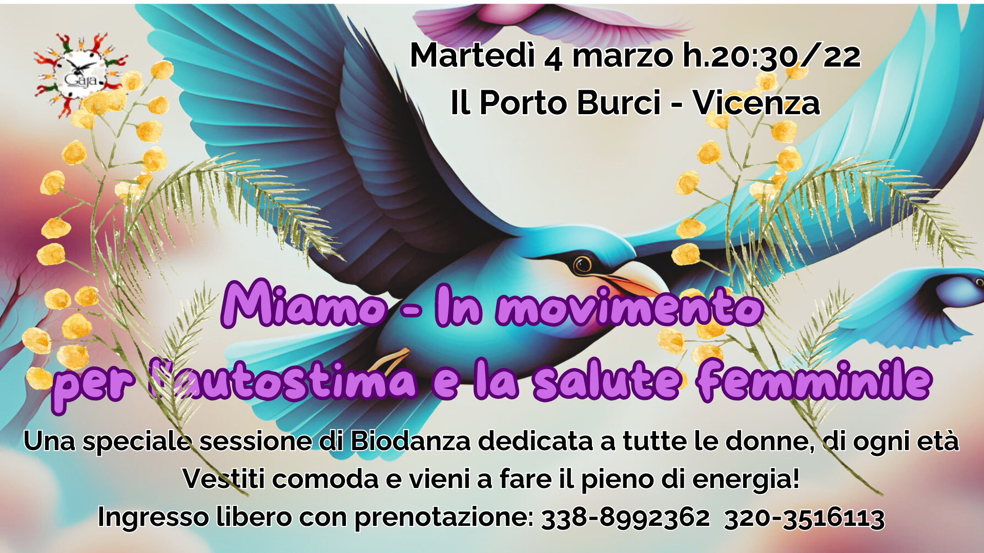 Ed ora Biodanza ritorna a Vicenza per le vicentine, promossa dagli insegnanti certificati del Centro Gaja-Scuola di Biodanza di Vicenza, con una speciale Masterclass “Biodanza al femminile": martedì 4 marzo (ore 20,30) , infatti, sarà possibile accedere gratuitamente al Porto Burci alla lezione open e gratuita. La prenotazione è obbligatoria al 338-8992362 320-3516113