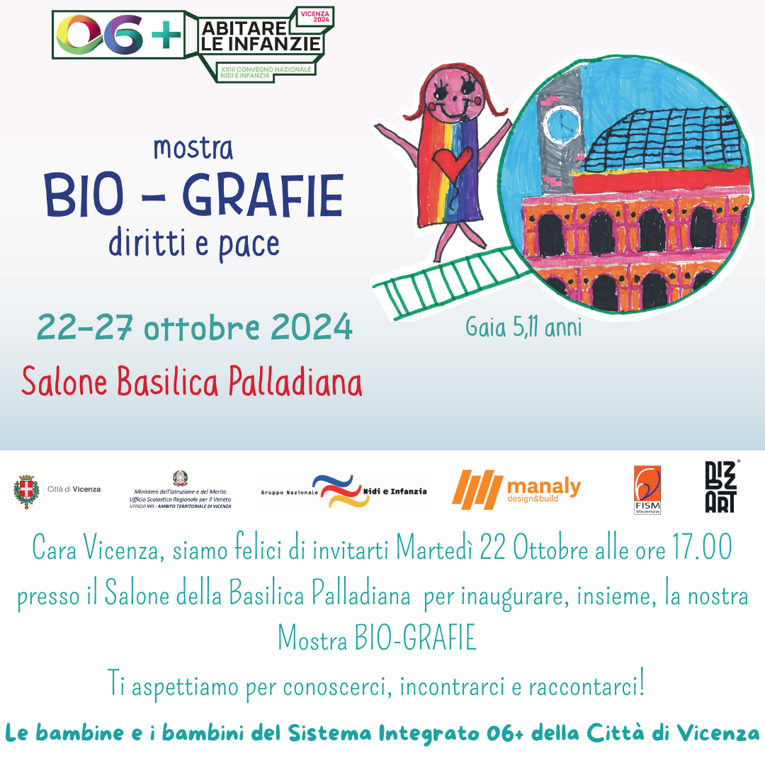 Le infanzie abiteranno gli spazi pubblici culturali della città che accoglieranno tra ambientazioni, installazioni e percorsi, i vissuti delle bambine e dei bambini del Sistema Integrato Zero-Sei di Vicenza. La mostra, attraverso tracce grafiche, colori, pensieri e parole racconta le esperienze educative e didattiche dei servizi educativi e delle scuole d’infanzia coinvolte sino alla prima classe della scuola primaria, Bio-grafie alla ricerca di una coerenza e continuità educativa nel sistema integrato di educazione e istruzione zero-sei. Le tematiche sviluppate sono quelle dei diritti dell'infanzia con particolare attenzione al diritto, oggi più che mai, alla PACE, diritti che le bambine e i bambini in maniera straordinaria e meravigliosa reclamano quotidianamente. Si entrerà fisicamente in un mondo dello zerosei che impara a raccontarsi con oltre 500 disegni e 200 tra pensieri e riflessioni espresse dalle famiglie.