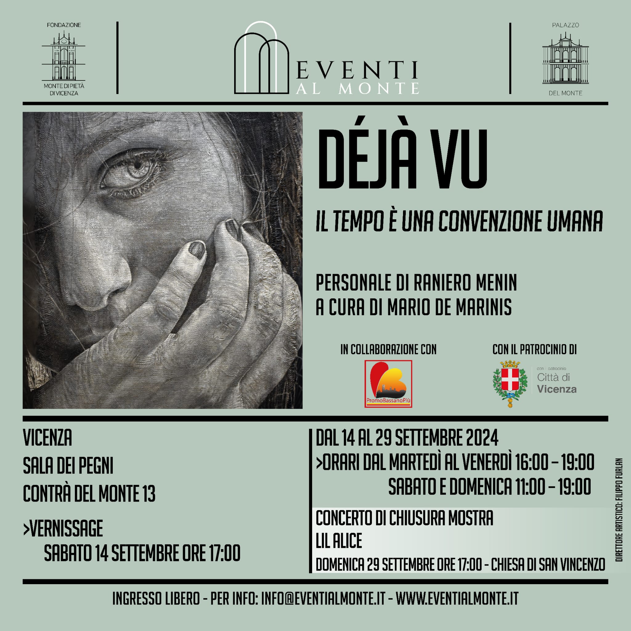 L’enigma del tempo, inteso come convenzione umana che tanto incide sulle nostre vite, è il tema della mostra d’arte del pittore bassanese Raniero Menin a titolo “Déjà vu”, inaugurata sabato 14 settembre 2024 con vernissage alle ore 17 nella Sala dei Pegni del Palazzo del Monte di Pietà di Vicenza. Promossa dalla Fondazione Monte di Pietà con il patrocinio del Comune, la mostra, curata da Mario De Marinis, va intesa come un percorso visionario che si pone al di là di quel tempo che è illusoria bilancia sulla quale soppesiamo il valore delle nostre vite; con sguardo originale calibrato su uno stile naturalistico in cui trionfa la figura umana, l’artista dipinge un’estetica al servizio dello stupore, immortalando attimi di tensione psicologica che hanno spesso per protagonisti soggetti femminili.