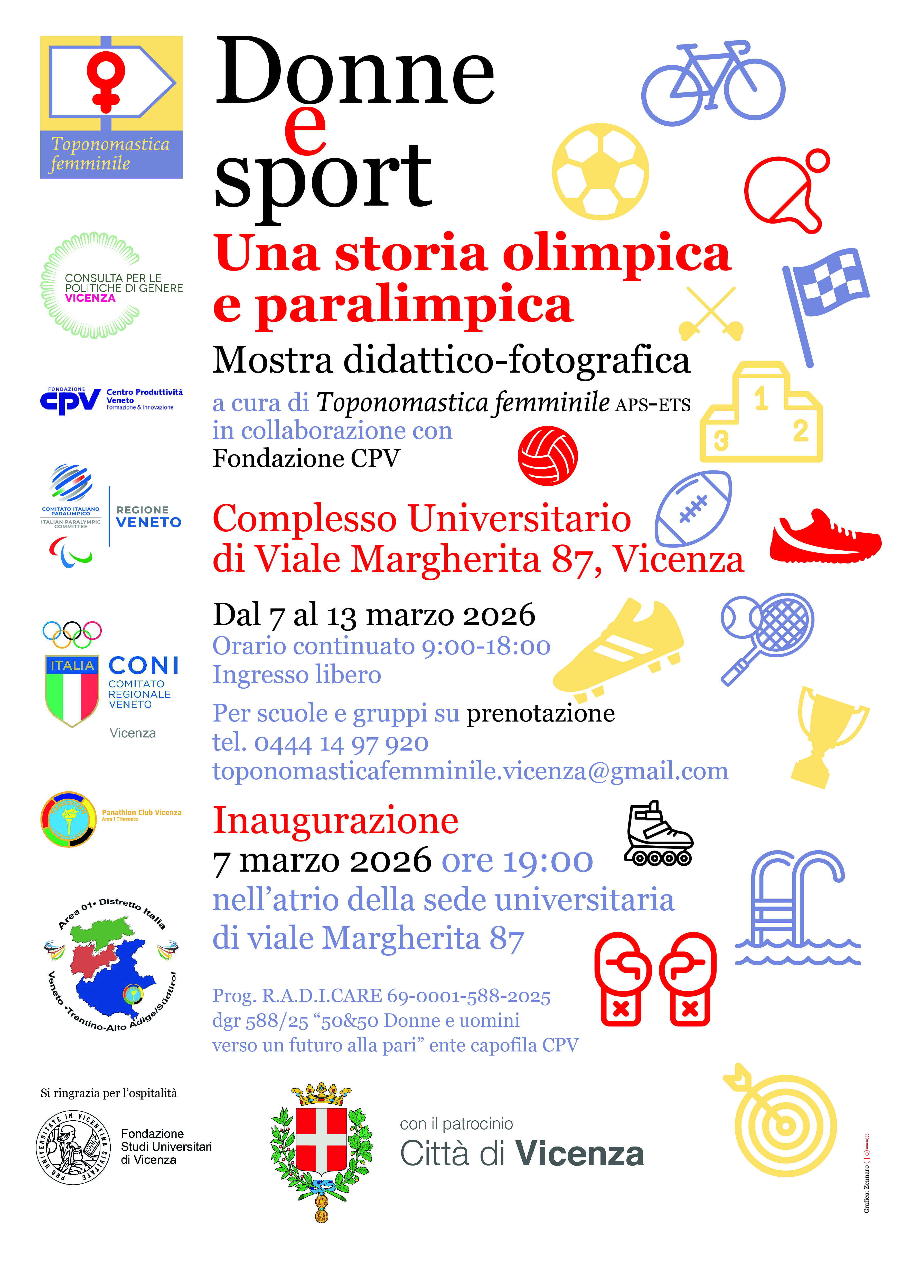 La mostra, gentilmente ospitata dalla Fondazione Studi Universitari di Vicenza, è patrocinata dalla Città di Vicenza ed è inserita nel calendario degli eventi per l’8 marzo.L’inaugurazione si svolgerà sabato 7 marzo 2026 presso il complesso universitario di viale Margherita 87 Vicenza, ore 19 circa al termine del talk Storie di donne, storie di sport.