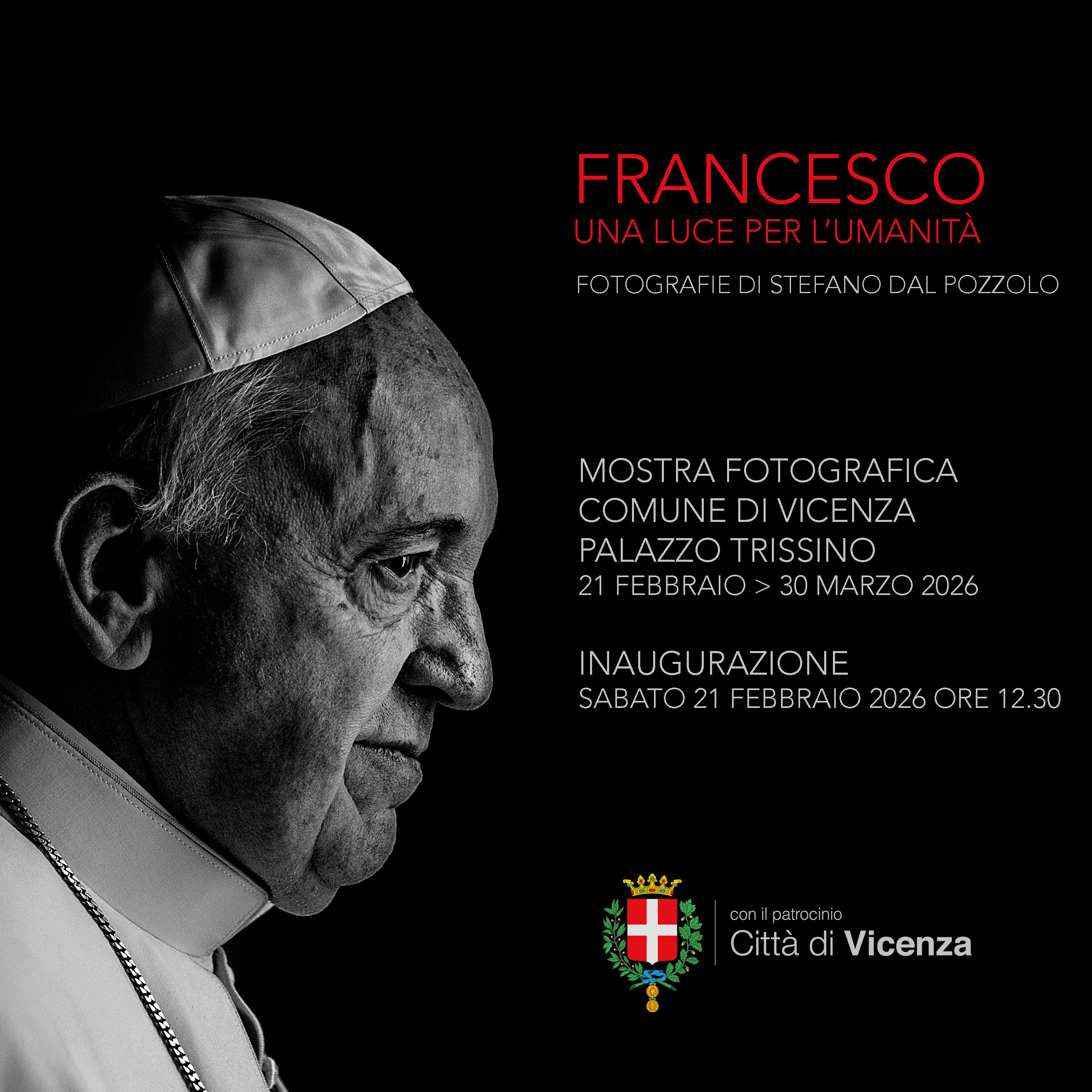 “Francesco. Una luce per l’umanità” è la nuova mostra fotografica promossa dal Comune di Vicenza allestita nella piazza culturale del cortile di Palazzo Trissino. L’esposizione racconta, attraverso le stampe di 30 scatti del fotografo vaticanista vicentino Stefano Dal Pozzolo, i dodici anni del pontificato di Papa Francesco proponendo uno sguardo intimo e inedito.