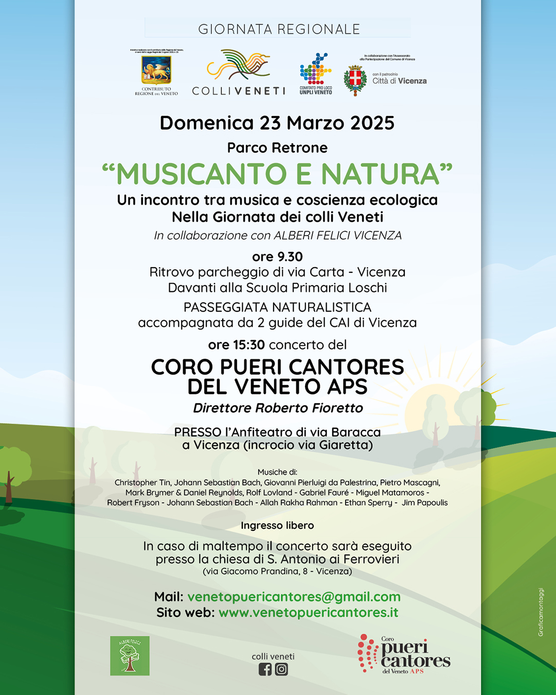 In occasione della Giornata Regionale per i Colli Veneti, che si celebrerà domenica 23 marzo 2025, il coro Pueri Cantores del Veneto propone, in collaborazione con l’Assessorato alla Partecipazione del Comune di Vicenza, l’Assessorato al Territorio e alla Cultura della Regione Veneto e Alberi Felici di Vicenza, l’evento “Musica e Natura”: il fascino della magia musicale nel creato”. Si tratta di una giornata a carattere ecologico rivolta a grandi e piccoli per far conoscere e visitare il Parco Retrone di Vicenza, un viaggio accompagnato dalla musica e dai canti dei ragazzi del coro Pueri Cantores del Veneto.