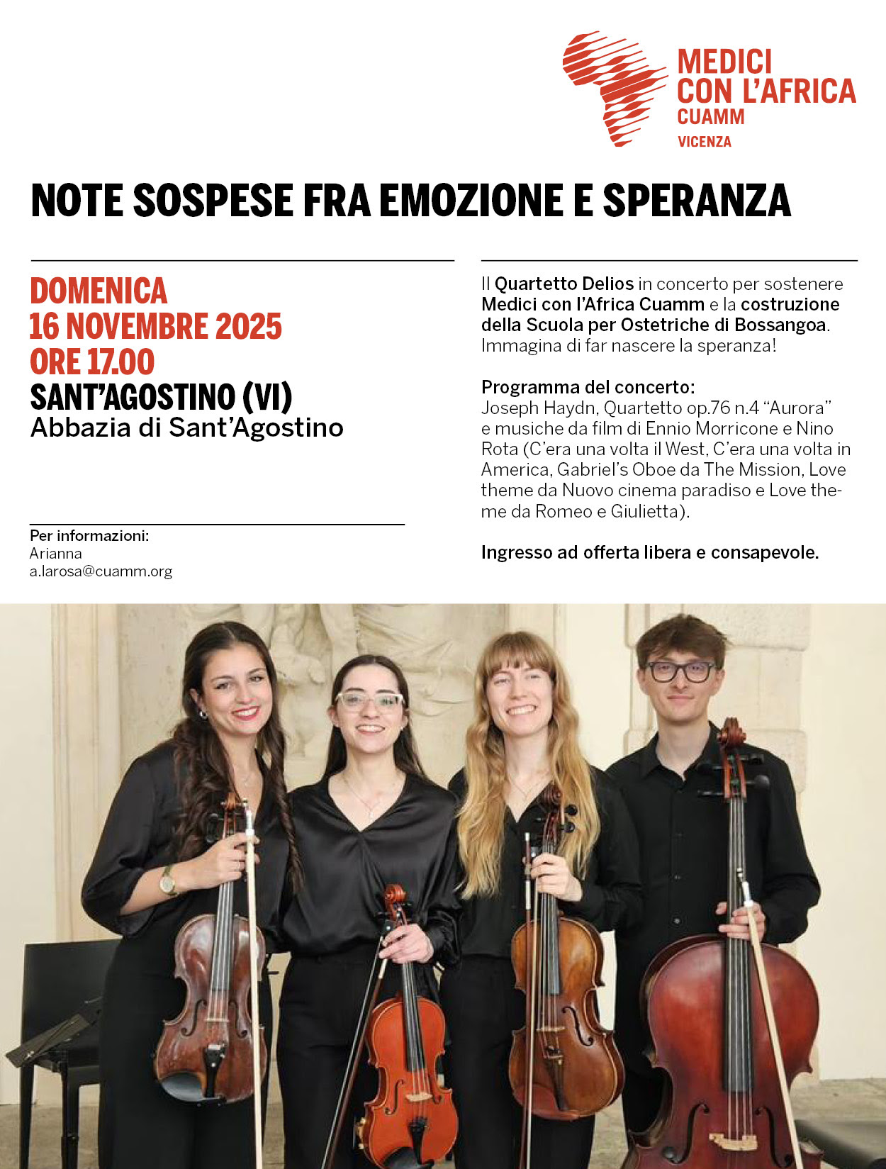 Concerto a scopo benefico del giovane quartetto d'archi "Delios" per sostenere l'attività di Medici con l'Africa CUAMM e in particolare la Scuola per Ostetriche di Bossangoa nella Repubblica Centrafricana