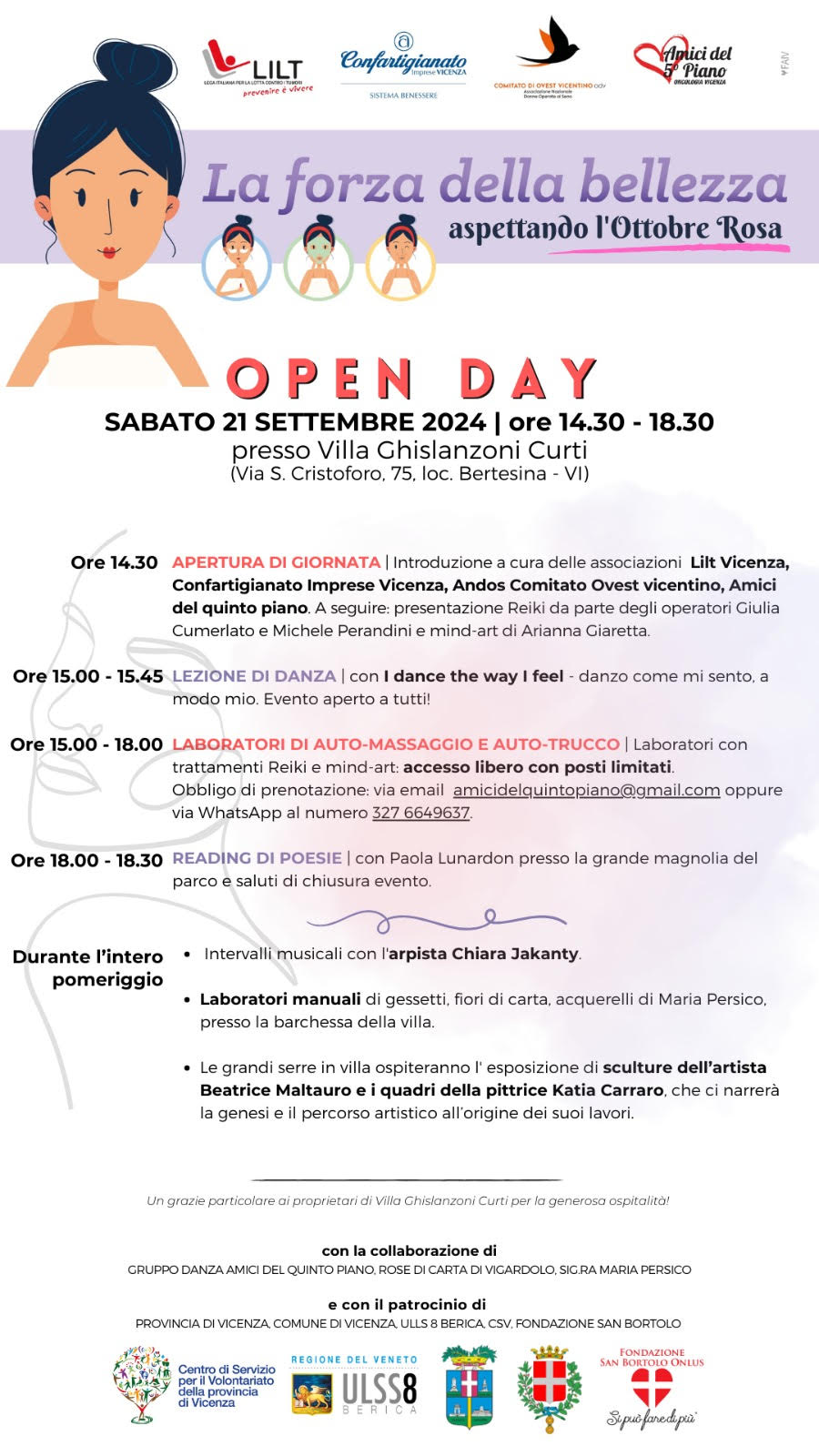 Sarà la giornata ufficiale di inaugurazione del mese rosa assieme a Confartigianato, Andos e Lilt e proporrà un momento di confronti e riflessioni in merito al bellissimo progetto “La forza della bellezza” attivo ormai da due anni.Ci sarà spazio per la danza con il progetto "I dance the way I feel", per i laboratori di auto-massaggio e auto-trucco, per la poesia, la musica e l'arte.Una ricca giornata che trascorrerà tra approfondimenti e momenti di sana leggerezza.