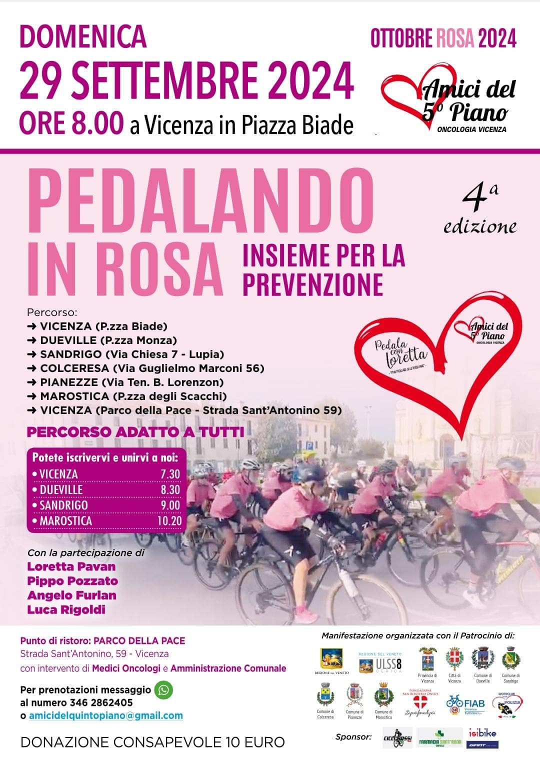Per tutti i ciclisti (e non) domenica 29 settembre saliremo tutti in sella assieme a Loretta e pedaleremo per sensibilizzare al tema della prevenzione dei tumori femminili.La 4 edizione di “Pedalando in Rosa” promette una giornata veramente magica: la partenza dalla nostra bellissima Piazza Biade, un tragitto adatto a tutti di circa 50 km, la possibilità di unirsi al gruppo in diversi punti, la partecipazione di grandi sportivi, l’arrivo a Parco della Pace a Vicenza per un momento conviviale di ristoro e confronto sul tema prevenzione.Tantissimi ingredienti per un appuntamento veramente da non perdere.