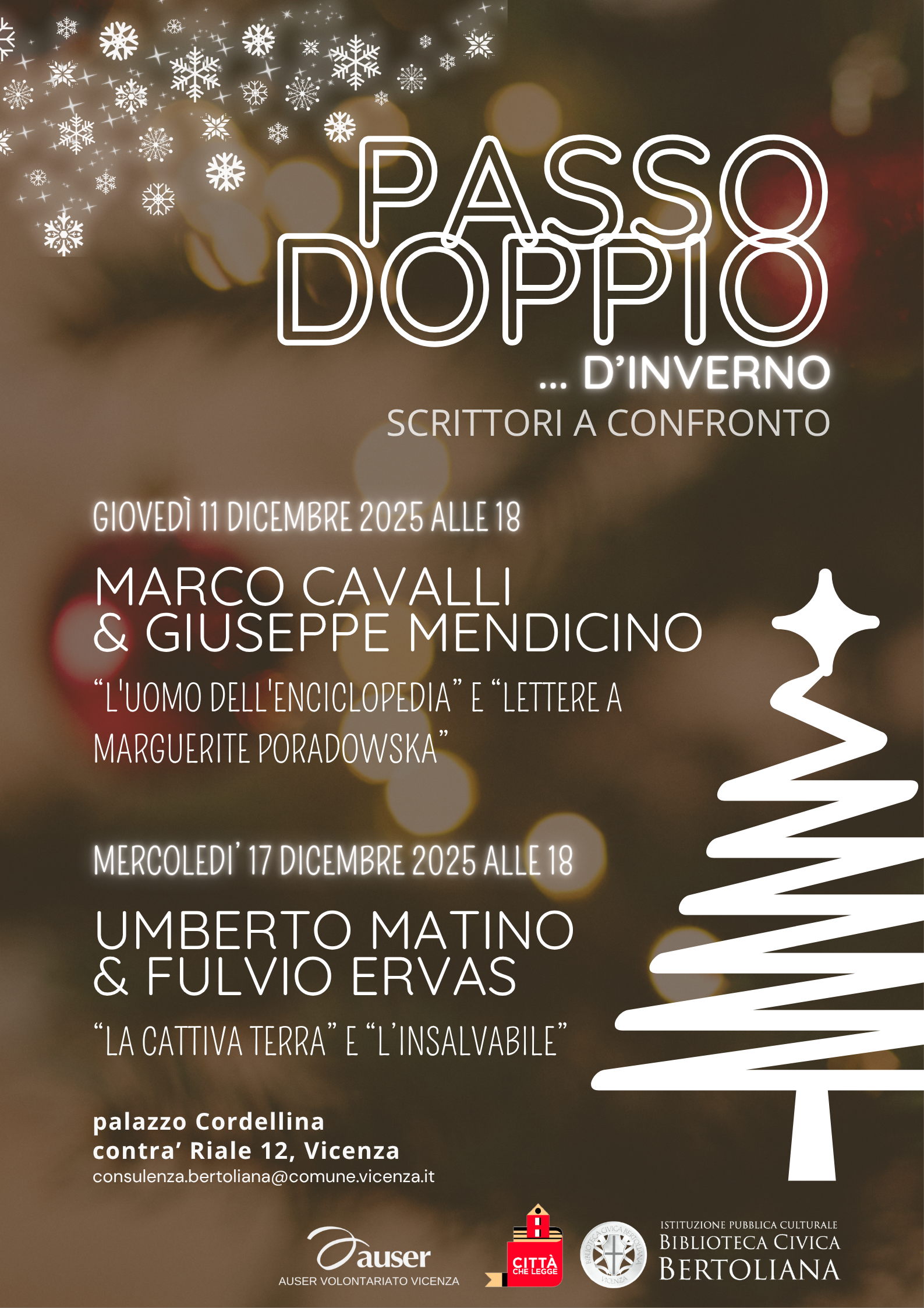 Torna in Bertoliana “Passo doppio. Scrittori a confronto”, ma in versione invernale. Dopo il successo ottenuto quest’estate nell’ambito della rassegna culturale “Cortili aperti”, palazzo Cordellina ripropone la fortunata formula in cui due autori incontrano il pubblico presentando ciascuno un libro dell’altro. Gli appuntamenti in calendario sono due, entrambi alle 18 in sala Dalla Pozza a palazzo Cordellina (contra’ Riale 12).
