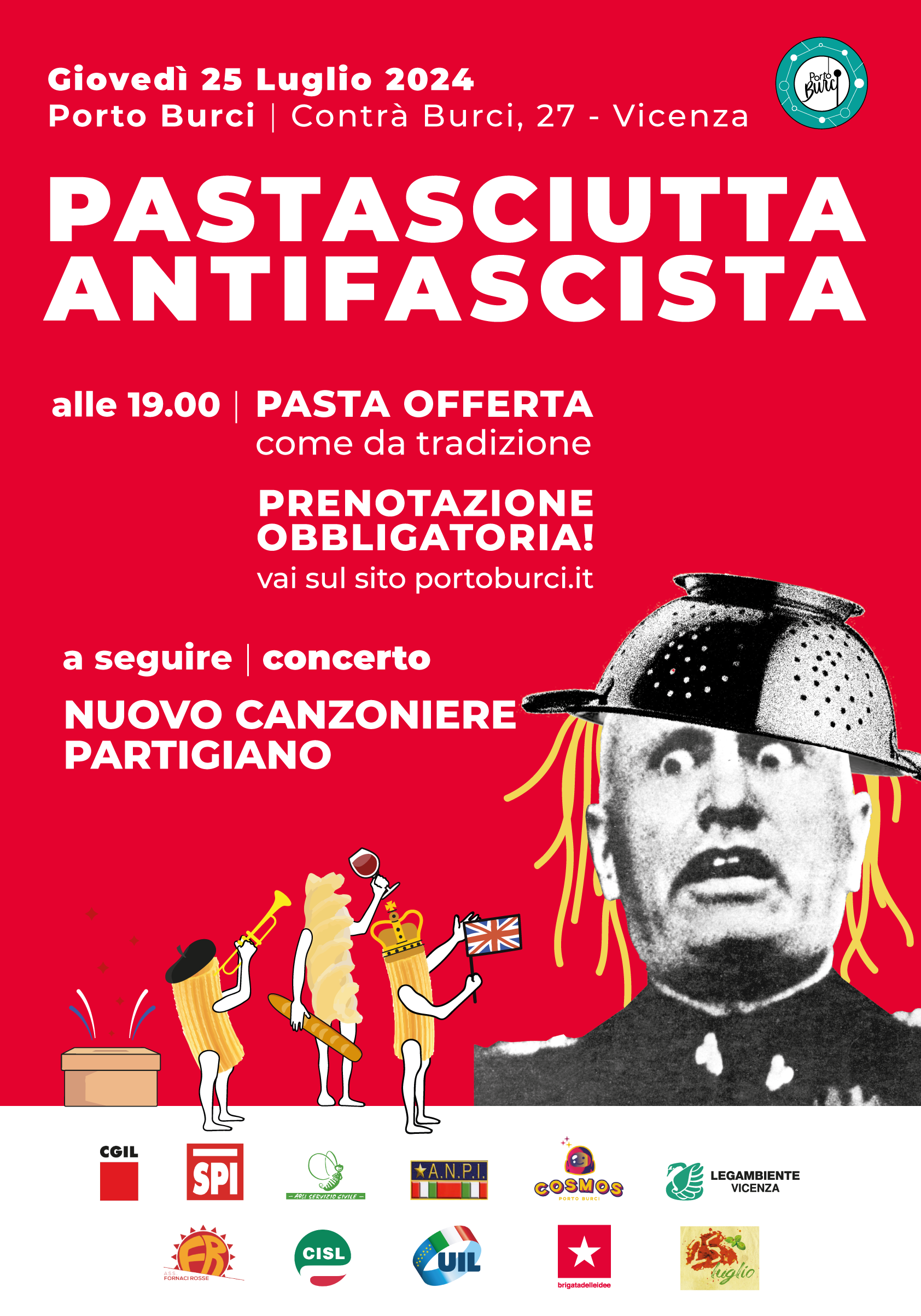A Vicenza come a Casa Cervi festeggiamo la caduta del fascismo, l’arresto di Mussolini e la memoria dei fratelli Cervi, offrendo un bel piatto di pastasciutta!