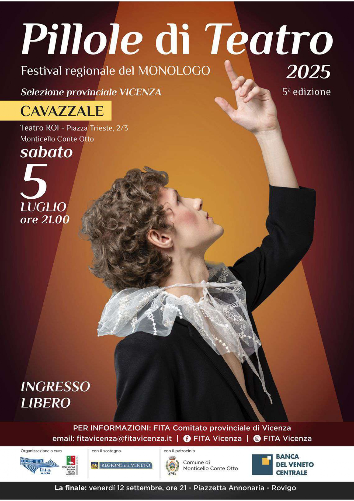 Sabato 5 luglio alle ore 21, al Teatro Roi di Monticello Conte Otto in frazione Cavazzale (provincia di Vicenza), appuntamento con la serata di selezione dei due interpreti della provincia di Vicenza che accederanno alla finalissima della quinta edizione del Festival regionale del monologo “Pillole di Teatro”, promosso da FITA Veneto, d’intesa con i suoi Comitati provinciali, il sostegno della Regione Veneto e il patrocinio dei Comuni ospitanti.