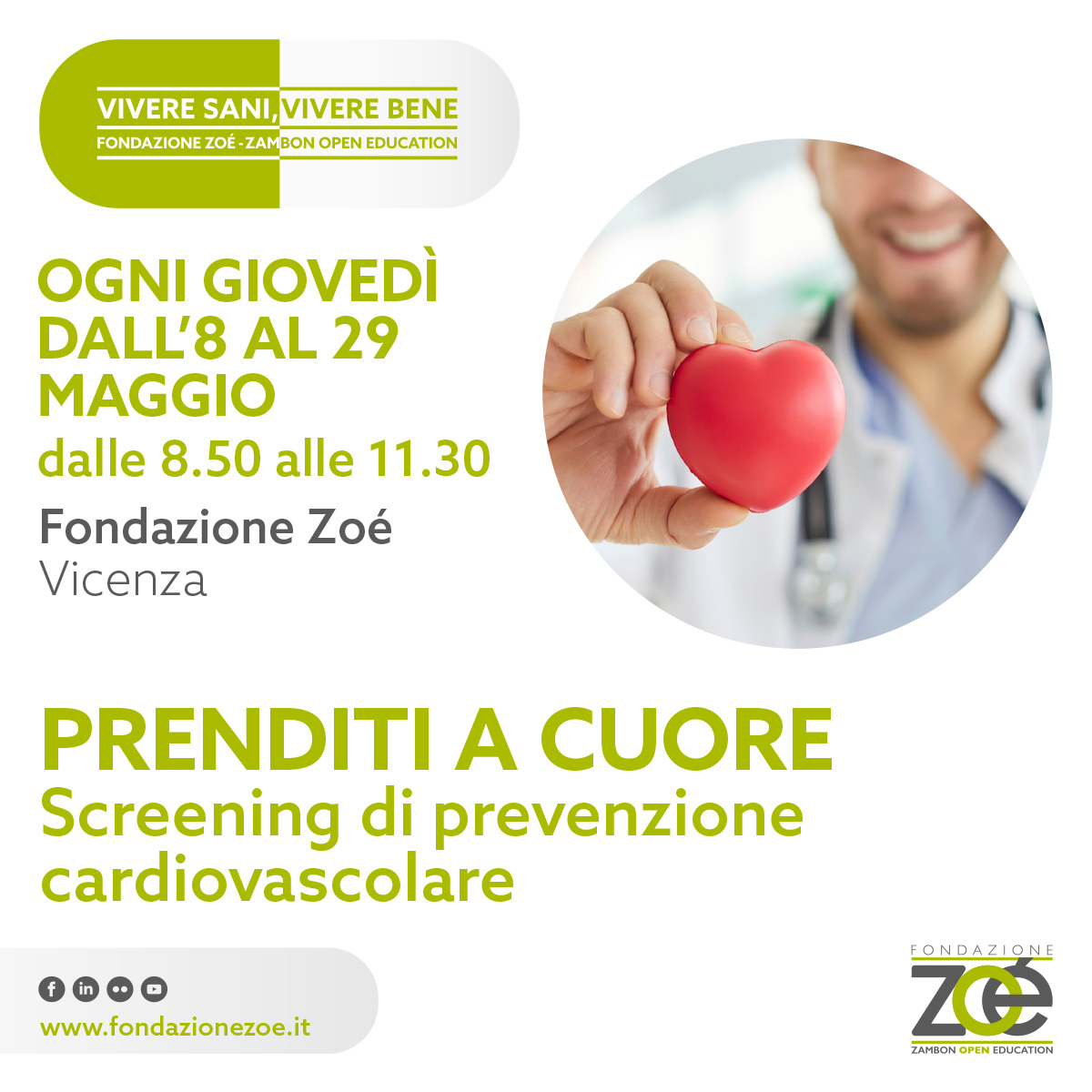 Fondazione Zoé, in collaborazione con l’associazione Amici del Cuore Vicenza Odv, propone un mese di screening cardiovascolare gratuito, con il supporto di medici e infermieri professionisti. Per evitare problemi cardiovascolari è fondamentale adottare uno stile di vita sano, monitorare pressione sanguigna, colesterolo e glicemia, sottoporsi a controlli periodici con il medico e seguire con attenzione le indicazioni ricevute. Un modo facile per prendersi cura di sé e avere a cuore la propria salute.