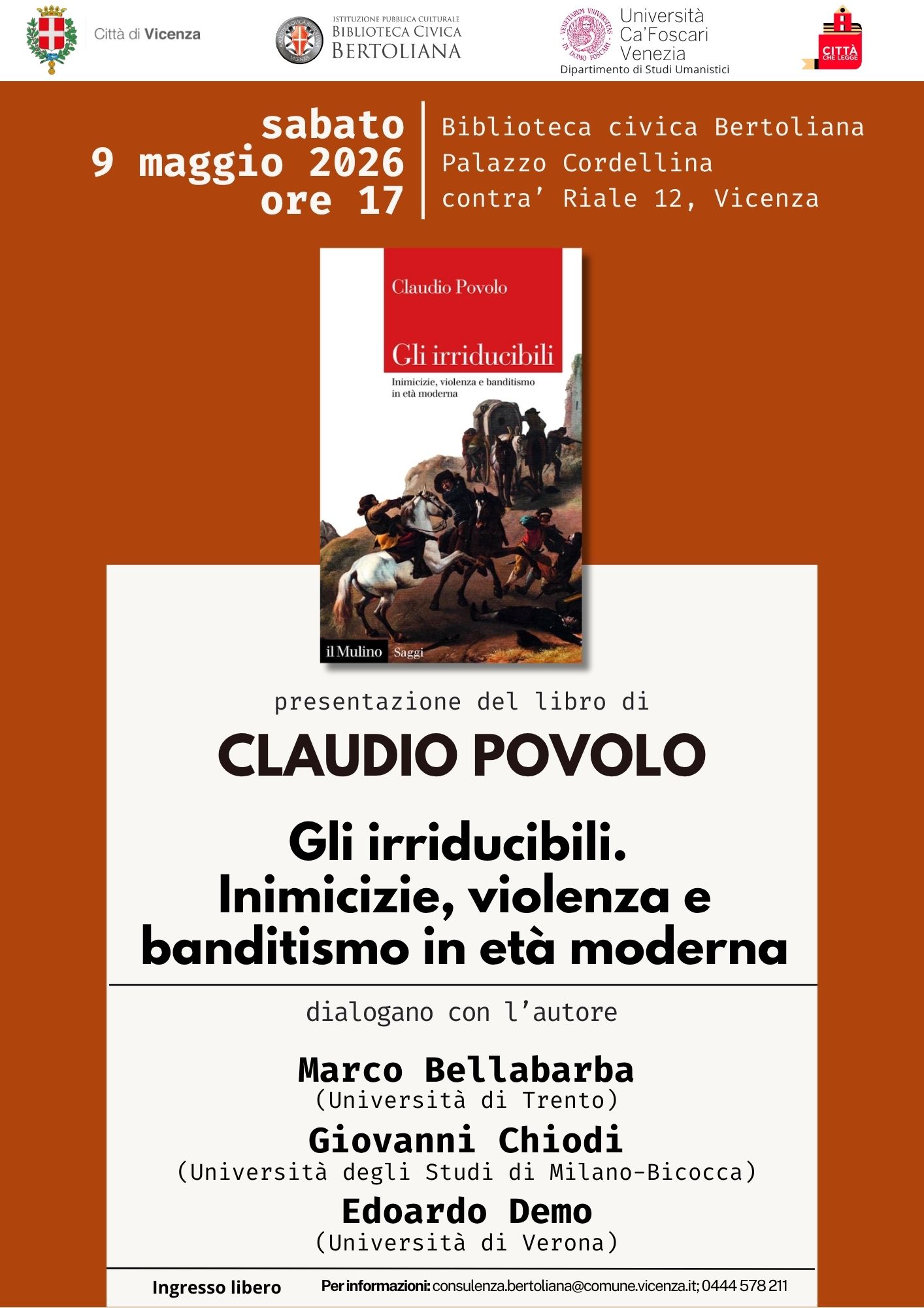 Sabato 9 maggio, alle ore 17:00, Palazzo Cordellina, sede della Biblioteca Civica Bertoliana, ospiterà la presentazione dell'ultima opera del professor Claudio Povolo: Gli irriducibili. Inimicizie, violenza e banditismo in età moderna.