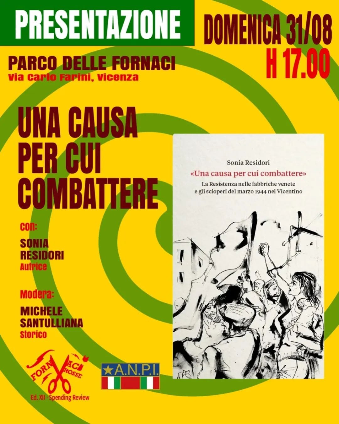 Nell'ambito dell'edizione 2025 del festival "Fornaci Rosse", domenica 31 agosto 2025 alle ore 17:00 al Parco delle Fornaci in Via Farini a Vicenza, si terrà la presentazione del libro “Una causa per cui combattere” di Sonia Residori. Sarà presente l'autrice. Modera lo storico Michele Santuliana