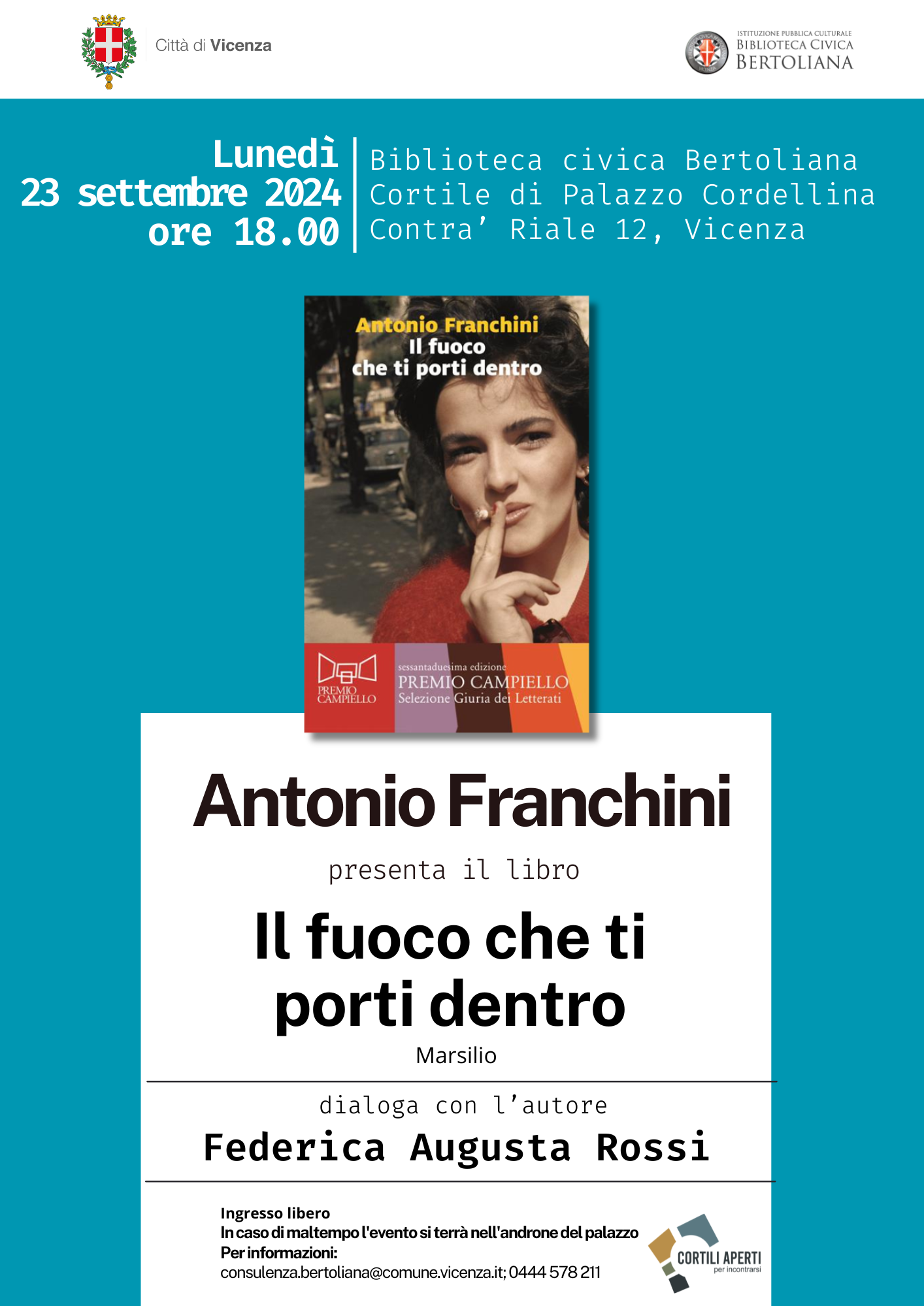 Il giorno 23 settembre alle ore 18 a palazzo Cordellina Antonio Franchini presenterà il suo libro Il fuoco che ti porti dentro. Dialogherà con l'autore Federica Augusta Rossi