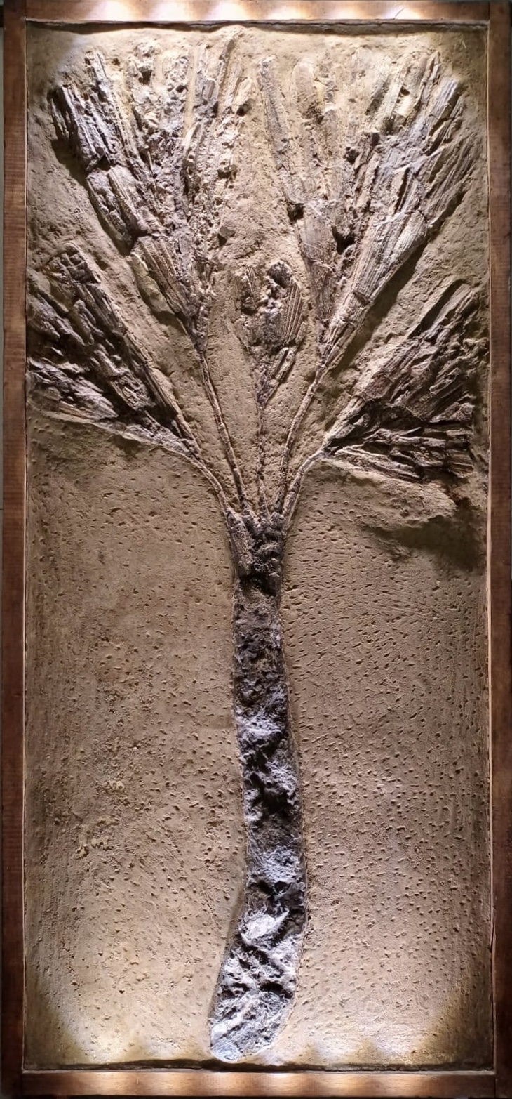 La palma fossile misura quasi due metri di altezza; proviene molto probabilmente dalla Purga di Bolca (Verona), area famosa per la sua flora e fauna tropicali: sono state rinvenute, infatti, palme, coccodrilli e testuggini d’acqua dolce.