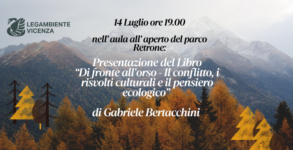Il 14 Luglio si terrà Presso l'aula didattica all’ aperto di parco Retrone (in caso di maltempo l'evento si svolgerà al centro dei Ferrovieri “la Locomotiva”), dalle 19:00, la presentazione del libro “Di fronte all’orso- il conflitto, i risvolti culturali, il pensiero ecologico”(2025, Infinito Edizioni) di Gabriele Bertacchini, naturalista e divulgatore ambientale.