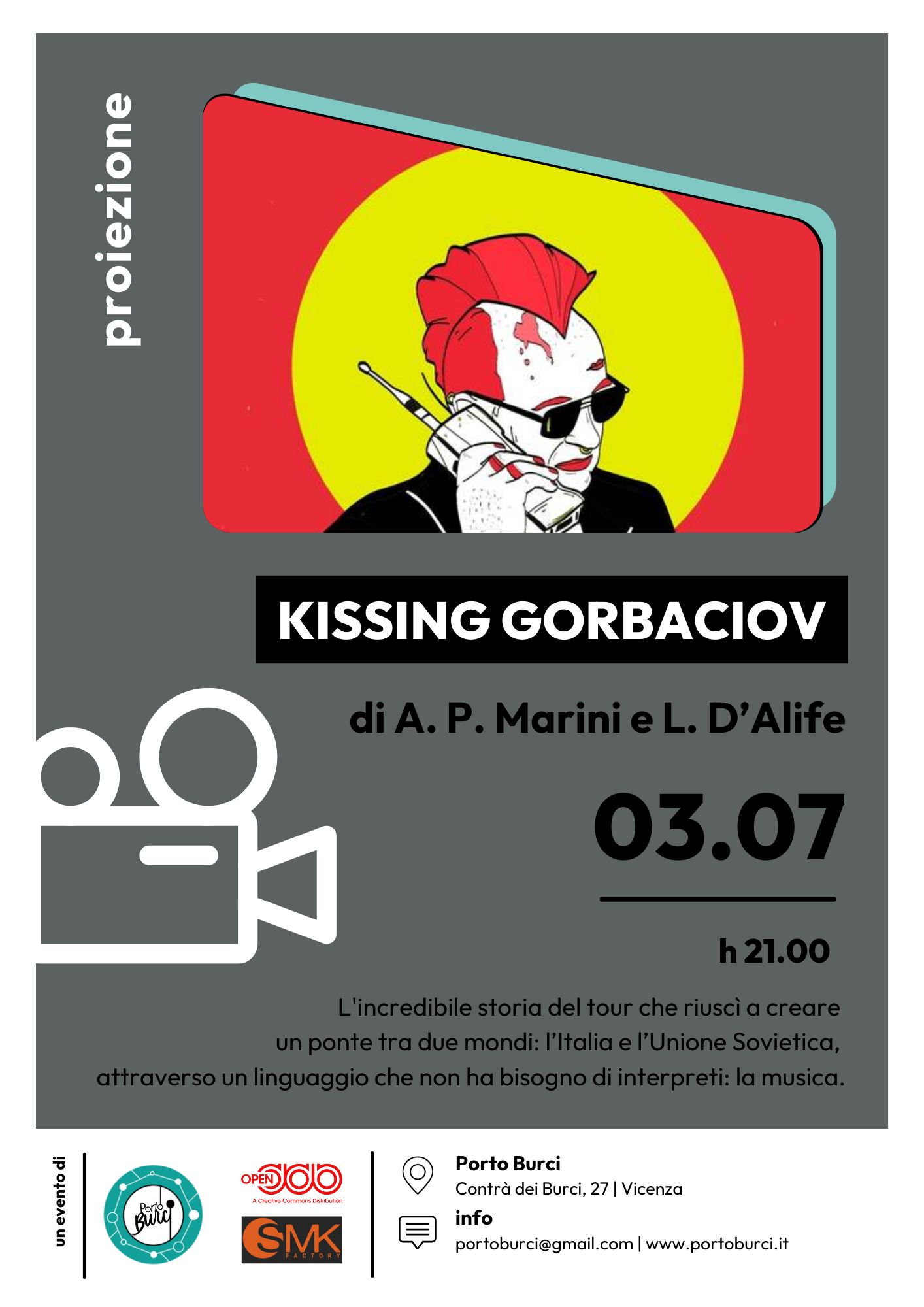 Proiezione del documentario “Kissing Gorbaciov” di A. P. Marini e L. D’Alife, prodotto da SMK Factory . Presentato per la prima volta al pubblico il 10 novembre 2023 nella sezione “Let the music play“ del 64° Festival dei Popoli.