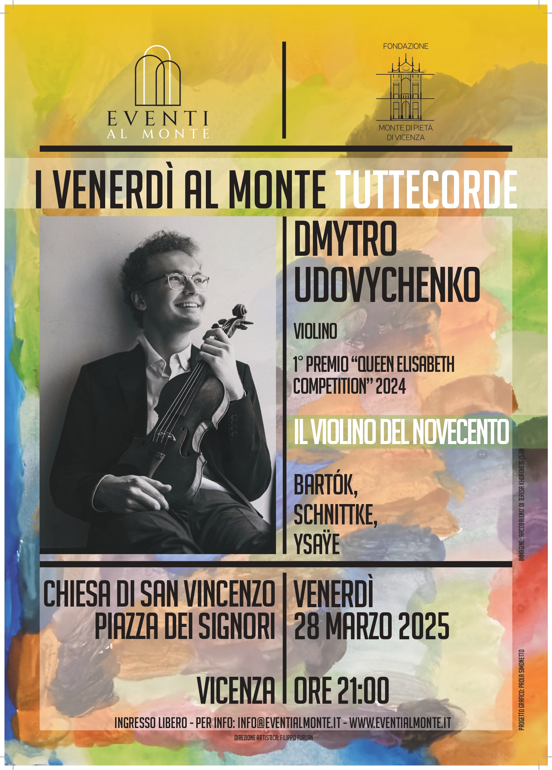 Venerdì 28 marzo ore 21 il terzo e ultimo appuntamento si apre agli artisti internazionali con la proposta del recital “Il violino del Novecento”del musicista Dmytro Udovychenko, straordinario talento postosi su di un solco di primissimo rango con la vittoria del 1° premio al “Queen Elisabeth Competition” di Bruxelles nel 2024, uno dei più prestigiosi concorsi mondiali, voluto dal grande violinista e compositore belga Ysaÿe. La prima edizione del concorso, nel 1937, fu vinta da David Ojstrach. Udovychenko è qui alla sua prima data vicentina, in esclusiva per la Fondazione Monte di Pietà.