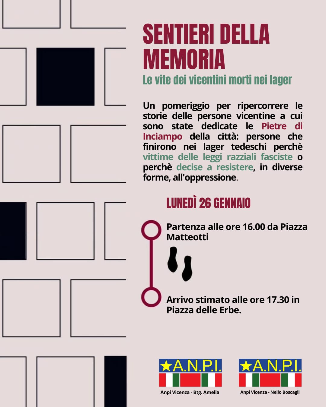 Un pomeriggio per ripercorrere le storie delle persone vicentine a cui sono state dedicate le Pietre di Inciampo della città: persone che finirono nei lager tedeschi perchè vittime delle leggi razziali fasciste o perchè decise a resistere, in diverse forme, all’oppressione.