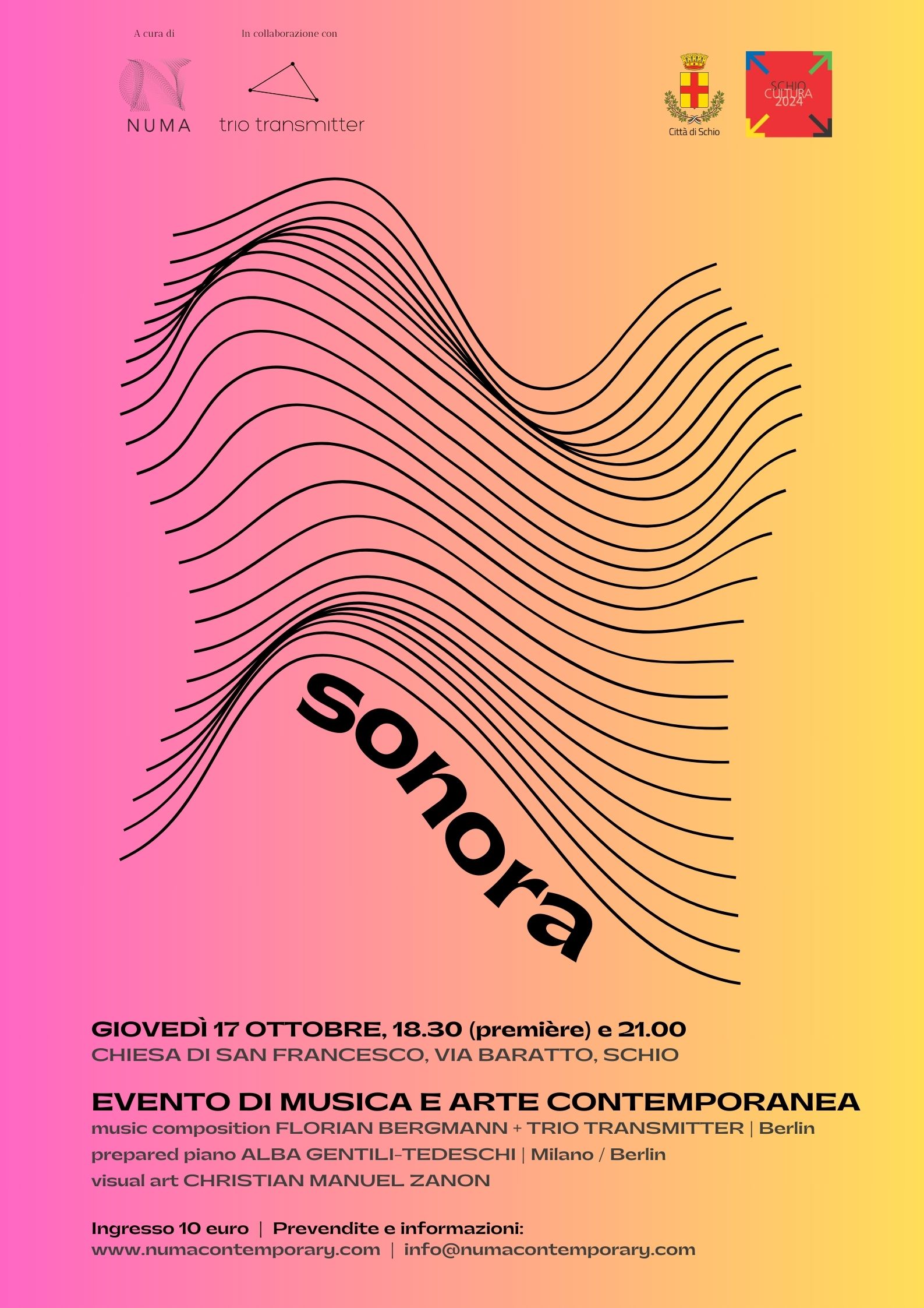 Nell’ambito della programmazione culturale 2024 del Comune di Schio, giovedì 17 avrà luogo Sonora. Timbrica visiva tra musica e arte contemporanea, doppio appuntamento performativo ed espositivo a cura di NUMA contemporary, nella suggestiva cornice della Chiesa di San Francesco.