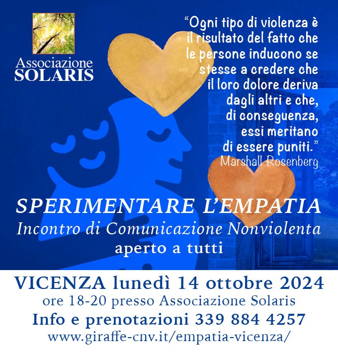 Incontro sulla Comunicazione Nonviolenta (14 ottobre) che si propone di avvicinare le persone alla Comunicazione Empatica Nonviolenta ideata da Marshall Rosenberg. "Ogni tipo di violenza è il risultato del fatto che le persone inducono se stesse a credere che il loro dolore deriva dagli altri e che, di conseguenza, essi meritano di essere puniti"