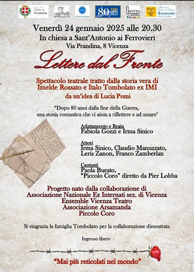 A 80 anni dalla fine della Seconda Guerra Mondiale, l’Associazione Nazionale Ex Internati Militari Italiani in collaborazione con Ensemble Vicenza Teatro, Associazione Arsamanda e il Piccolo Coro, propone lo spettacolo teatrale “Lettere dal Fronte” che si terrà venerdì 24 gennaio alle ore 20,30 presso la chiesa di Sant’Antonio ai Ferrovieri in via Prandina 8 a Vicenza. Il recital è tratto dalla storia vera di Imelde Rossato e Italo Tombolato ex Internato Militare.