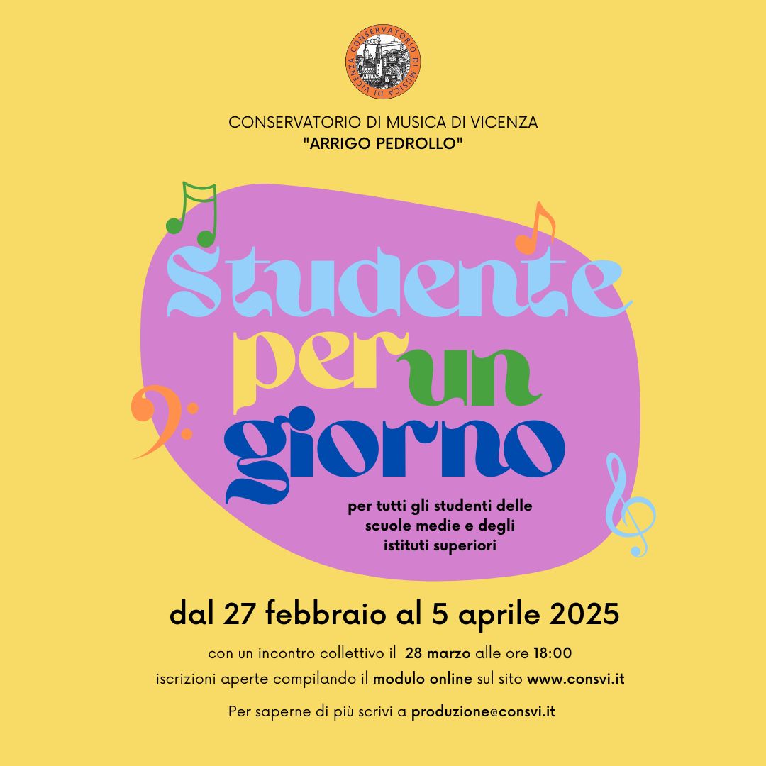 Si aprono il 27 febbraio le iscrizioni all'iniziativa "Studente per un giorno", un'opportunità per vivere l’esperienza di una giornata da studente del Conservatorio di Vicenza.