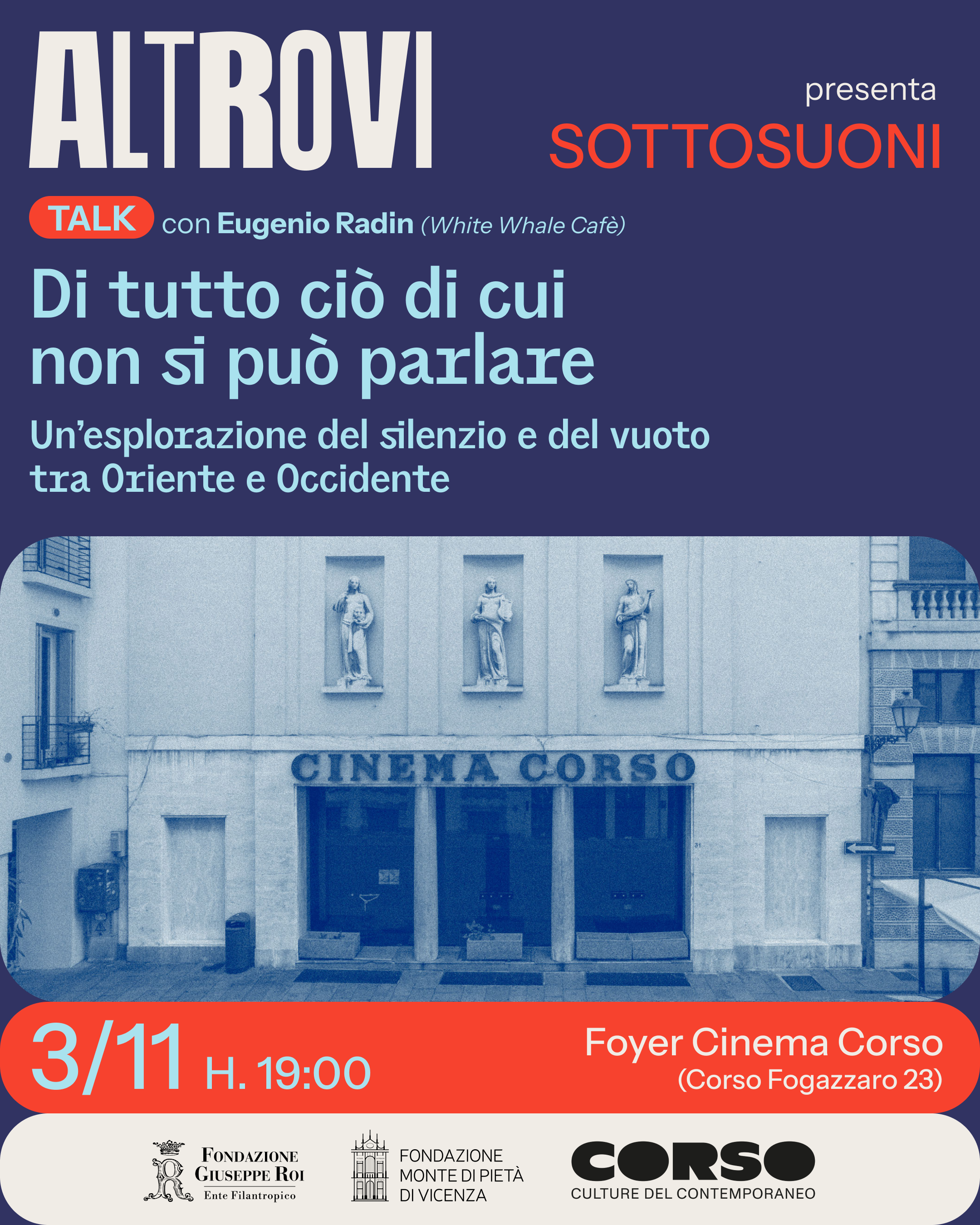 "Di tutto ciò di cui non si può parlare" è un talk con il divulgatore filosofico Eugenio Radin (White Whale Café) che esplora il silenzio e il vuoto come spazi di incontro tra filosofia e musica, tra pensiero orientale e occidentale, in dialogo con il contemporaneo. Attraverso parole e ascolti musicali, il pubblico sarà invitato ad intraprendere un viaggio nei territori del non detto e dell’ascolto profondo.