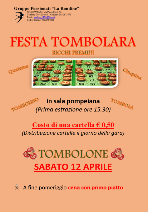 Tombolone con ricchi premi in sala pompeiana (prima estrazione alle ore 15:30).