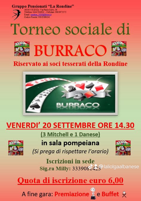 Per iscrizioni: Gruppo Pensionati La Rondine tel. 0444 504924,