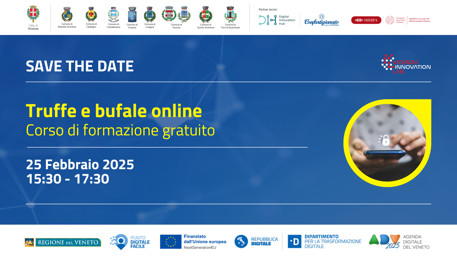 Il Comune di Vicenza, in collaborazione con il Digital Innovation Hub Vicenza e Sherpa, è lieto di annunciare l’evento “Truffe e bufale online: come difendersi”, un corso di formazione gratuito che si terrà il 25 febbraio 2025 dalle ore 15:30 alle ore 17:30.