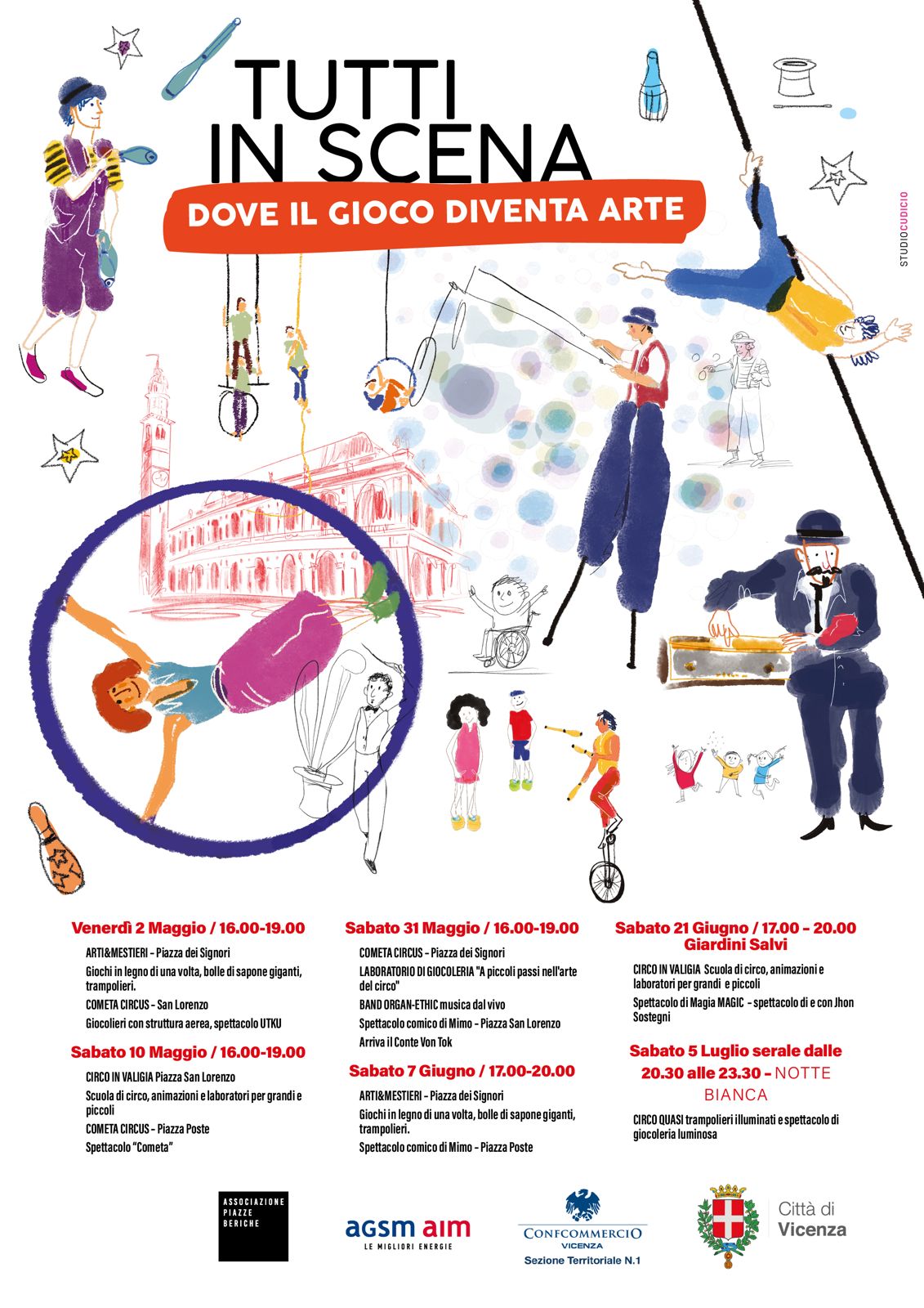Animazione con artisti di strada e intrattenimento per grandi e bambini sono gli ingredienti del programma di “Tutti in scena, dove il gioco diventa arte” rassegna di sei appuntamenti da maggio a luglio promossa dal Comune di Vicenza, ideata e organizzata da Federica Pagliara dell’Associazione Piazze Beriche e sostenuta da Agsm Aim e da Confcommercio Vicenza.