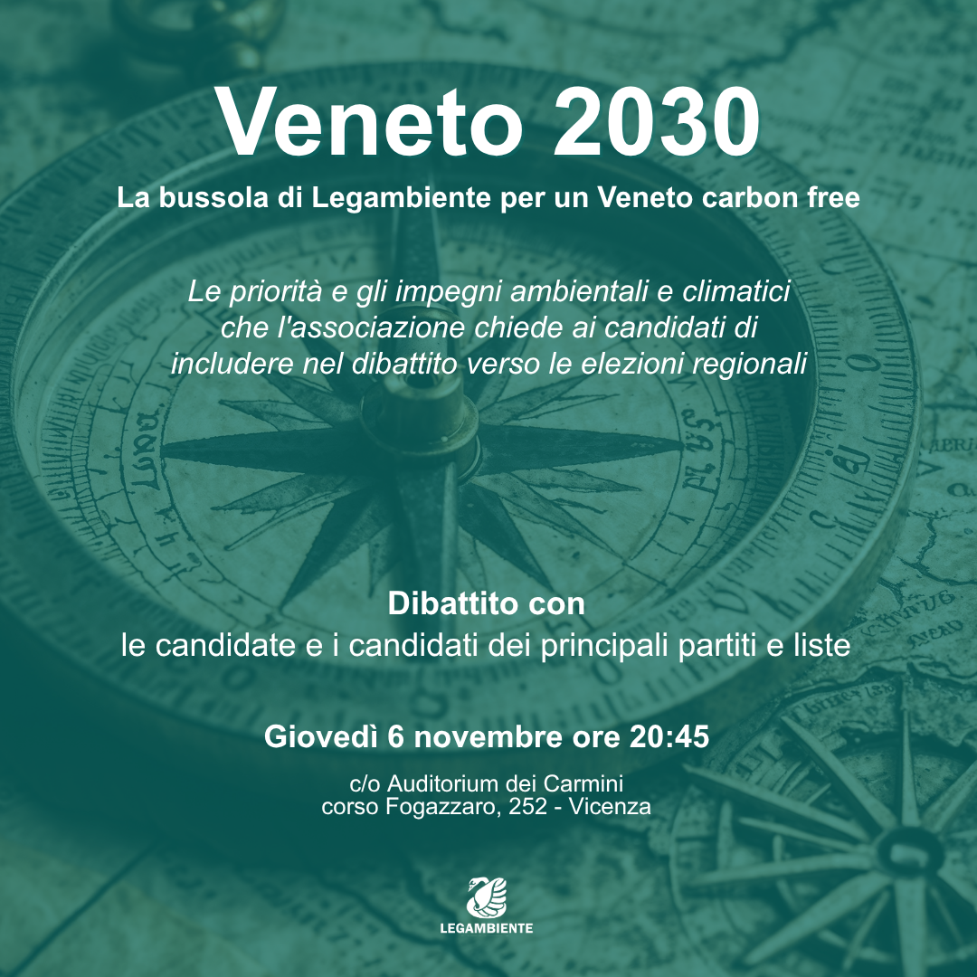 Se anche tu ti poni la stessa domanda o ti incuriosiscono le risposte, abbiamo una soluzione: giovedì 6 novembre, alle ore 20.45, i circoli Legambiente di Vicenza, Monticello Conte Otto e Ovest vicentino organizzano un dibattito pubblico con le liste che si presentano alle elezioni regionali del 23-24 novembre, per presentare e discutere il dossier “Veneto 2030: la Bussola di Legambiente per un Veneto carbon free”.