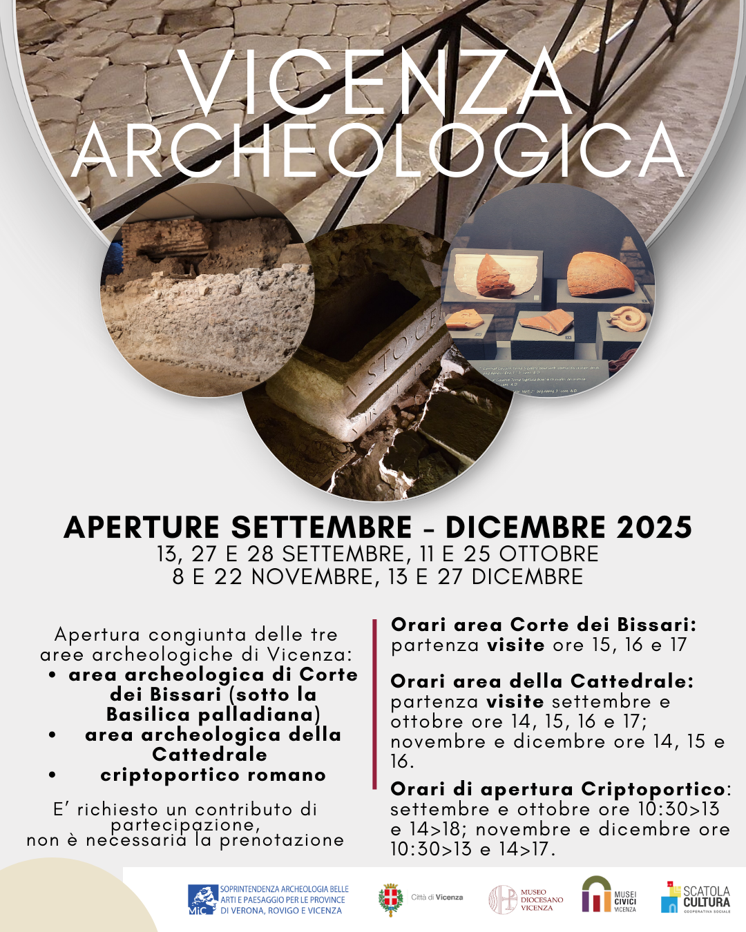 Da settembre a dicembre aperture congiunte delle tre aree archeologiche di Vicenza: Area archeologica di Corte dei Bissari (sotto la Basilica Palladiana), Area archeologica della Cattedrale di Vicenza e Cripto portico romano.
