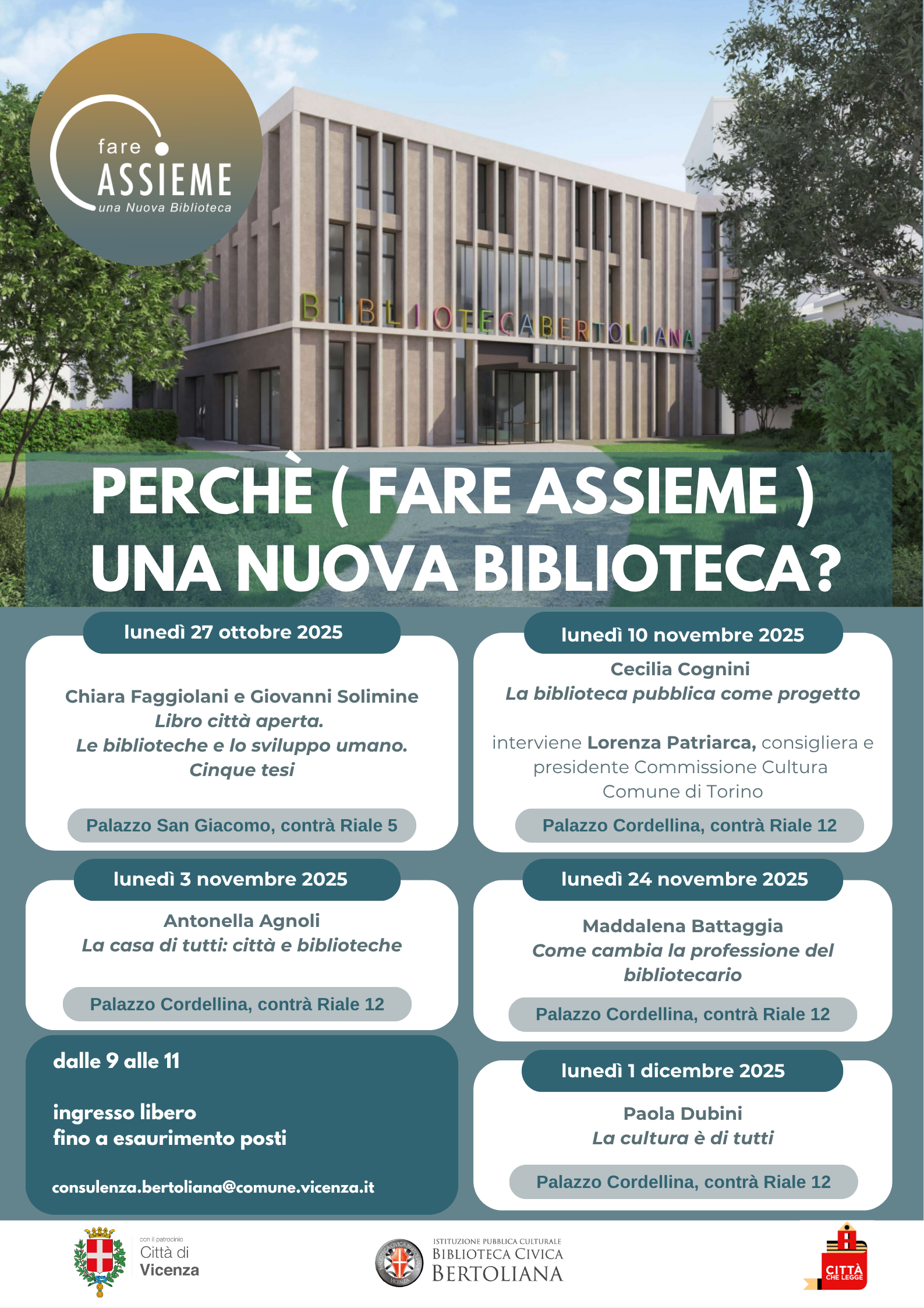 Con questo percorso, l’Amministrazione comunale e la Biblioteca Bertoliana intendono promuovere una riflessione collettiva sul ruolo della biblioteca come cuore culturale della città, uno spazio di conoscenza, incontro e crescita per tutta la comunità vicentina.