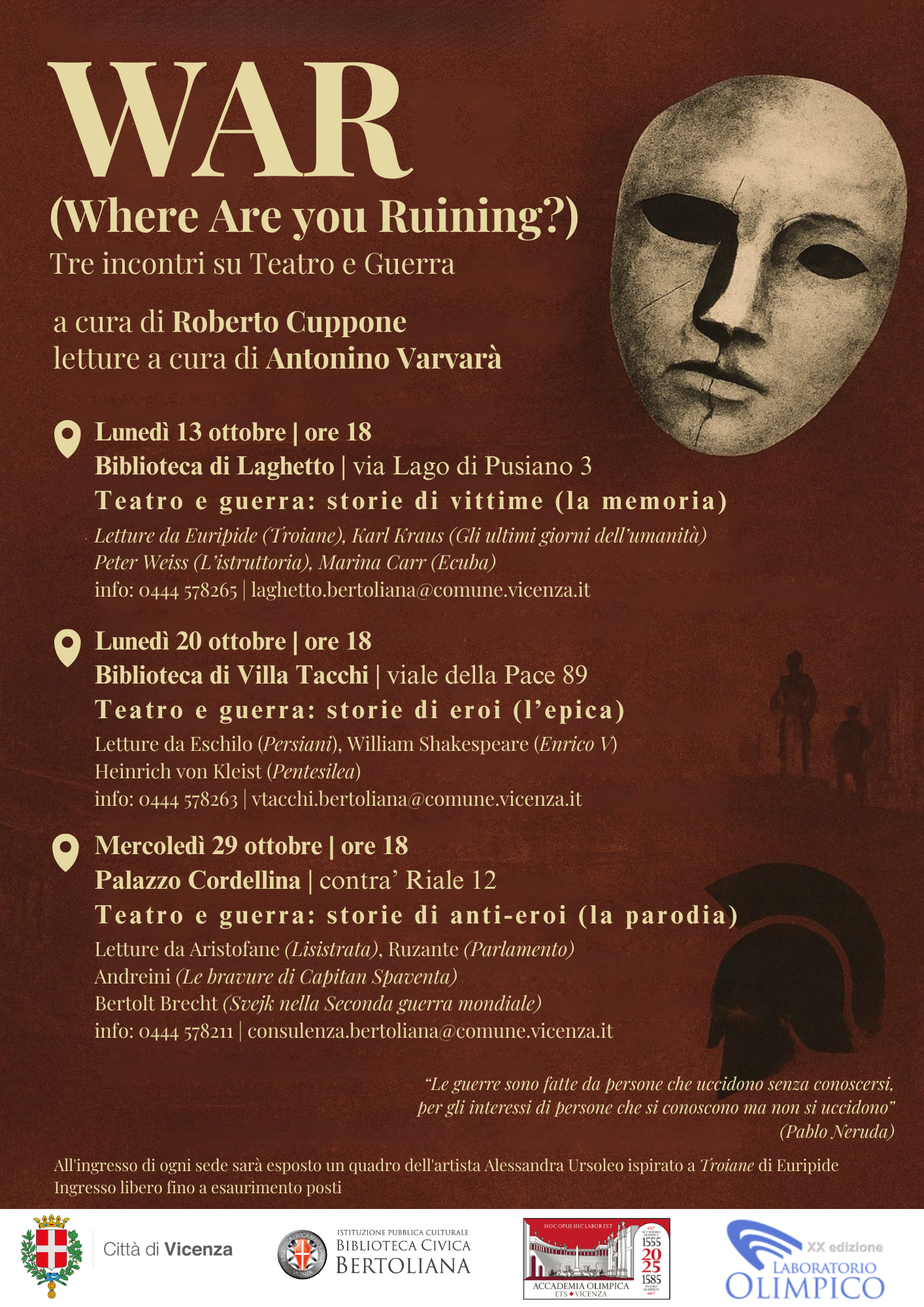 In occasione del ventennale del Laboratorio Olimpico, la Biblioteca civica Bertoliana, in collaborazione con l’assessorato alla Cultura del Comune di Vicenza e l’Accademia Olimpica, propone un ciclo di tre incontri-spettacolo dal titolo “War (Where are you ruining?)”, dedicato al rapporto tra teatro e guerra.