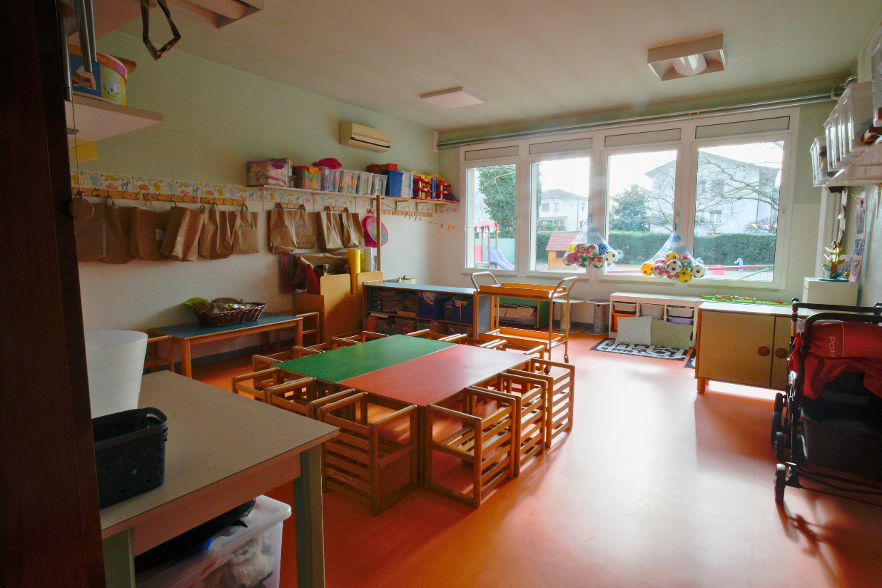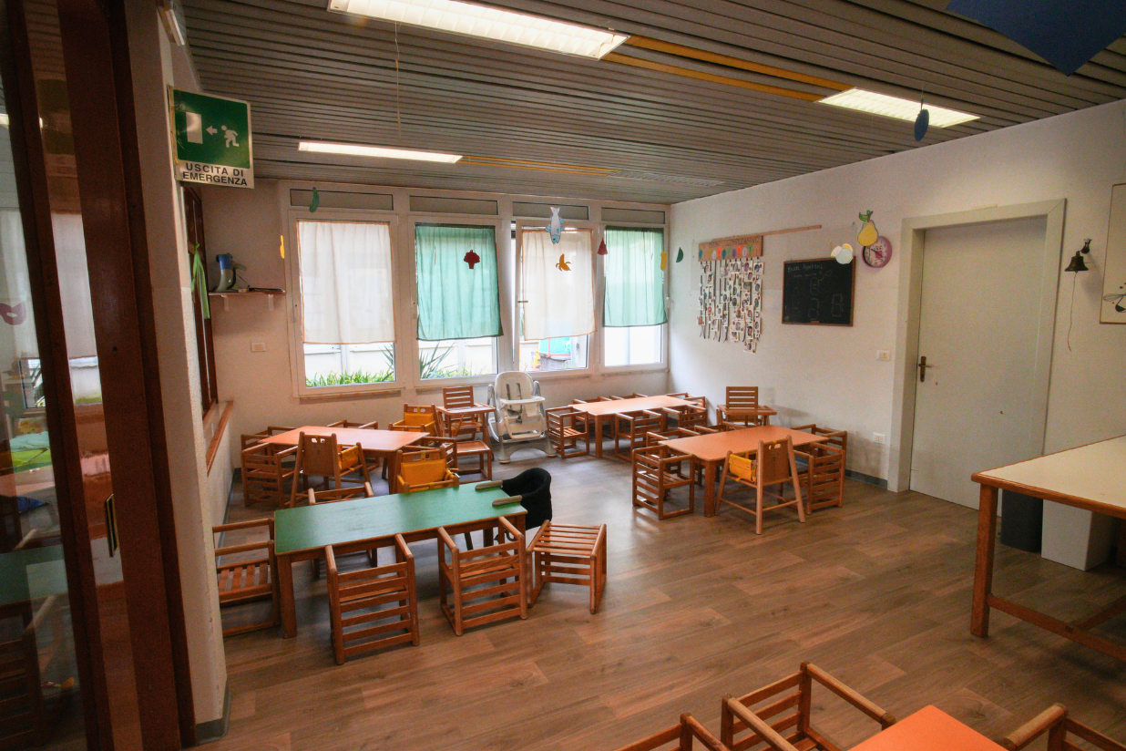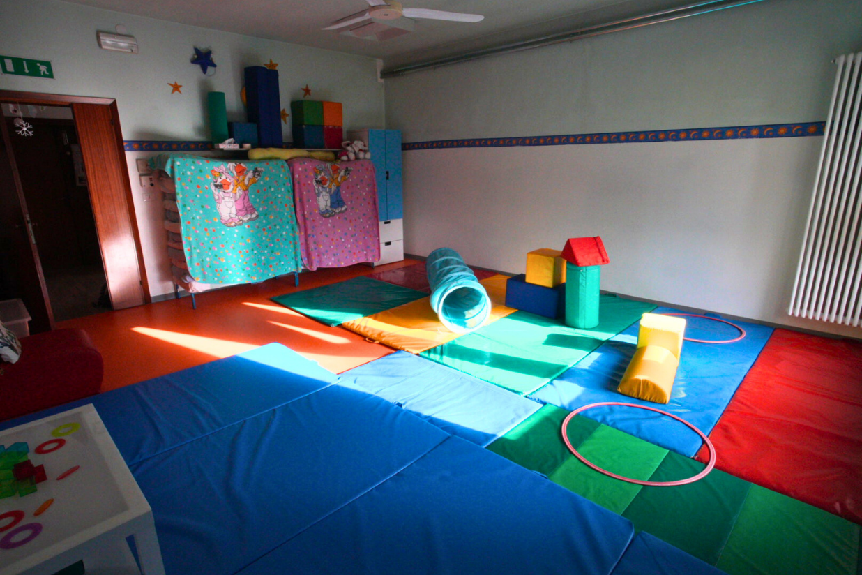 Gli spazi interni sono luminosi e organizzati per offrire molteplici esperienze, in ambiente curato e accogliente. Il salone, spazio di accoglienza, comprende tre aree: il gioco simbolico (far finta), il gioco motorio (muoversi e sperimentare il corpo) e la costruttività (creare e trasformare con materiali naturali e non convenzionali). La stanza della creatività offre spazi dedicati alla lettura e alla narrazione, al gioco simbolico e alle attività grafico-pittoriche e manipolative, offrendo occasioni di espressione e sperimentazione.