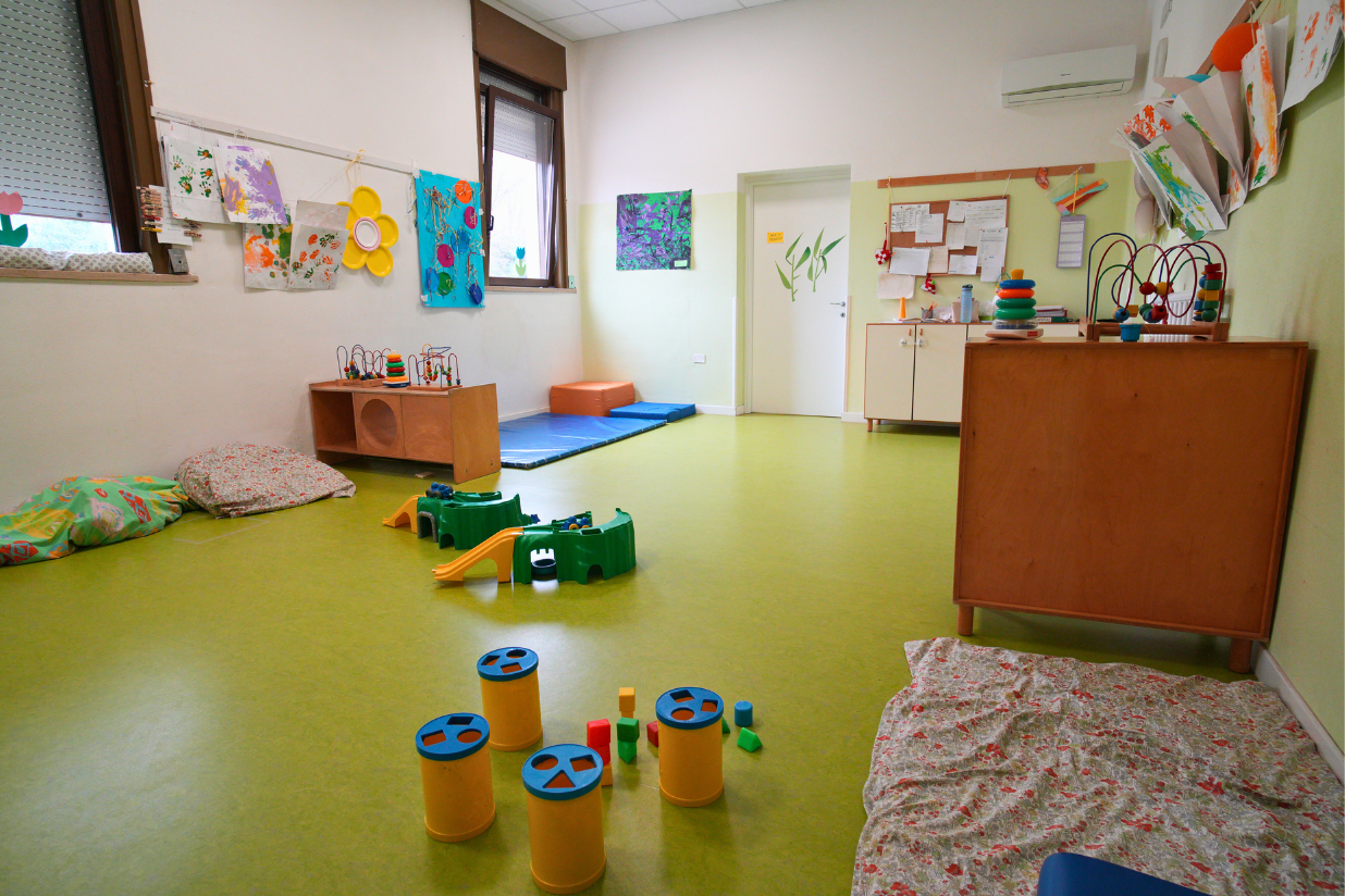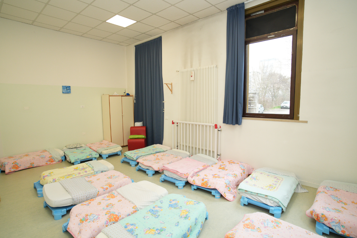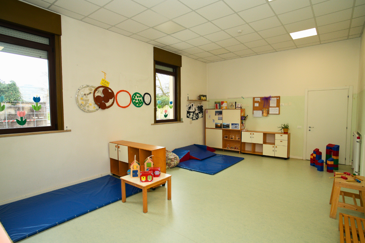 Le sezioni sono articolate in più ambienti, così da garantire una gestione funzionale della giornata al nido: stanza dedicata al gioco, area pranzo, bagno e spazio per il riposo. Sono inoltre presenti laboratori e palestra, a disposizione di tutti i bambini, per favorire esperienze diversificate e lo sviluppo motorio.