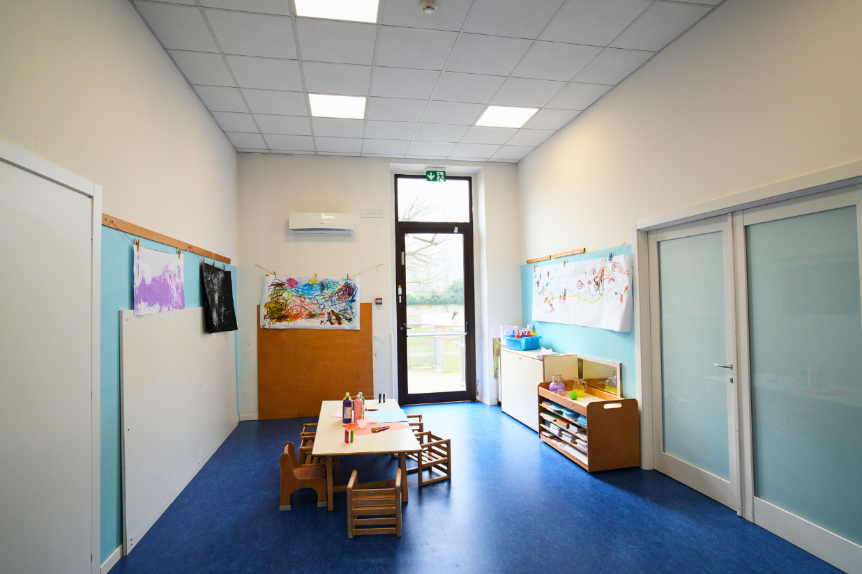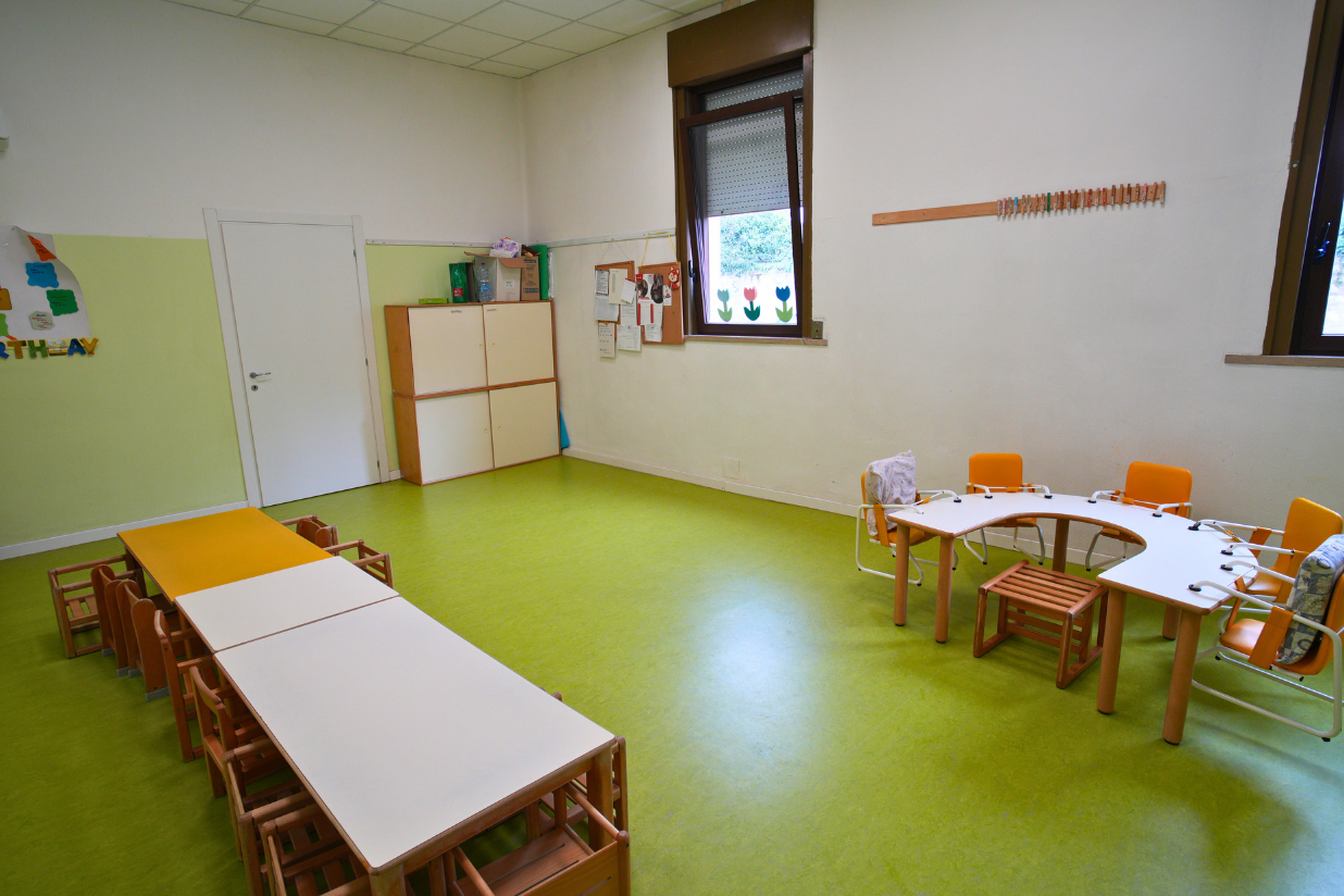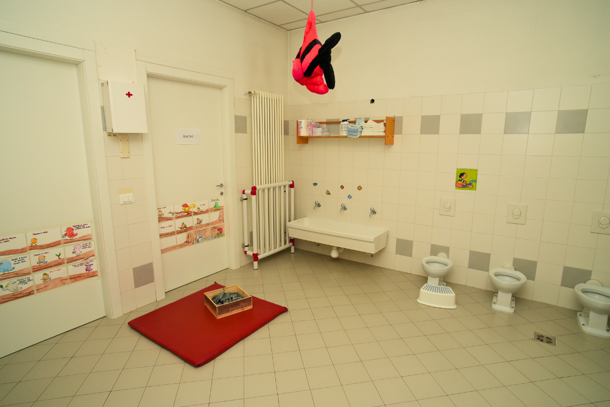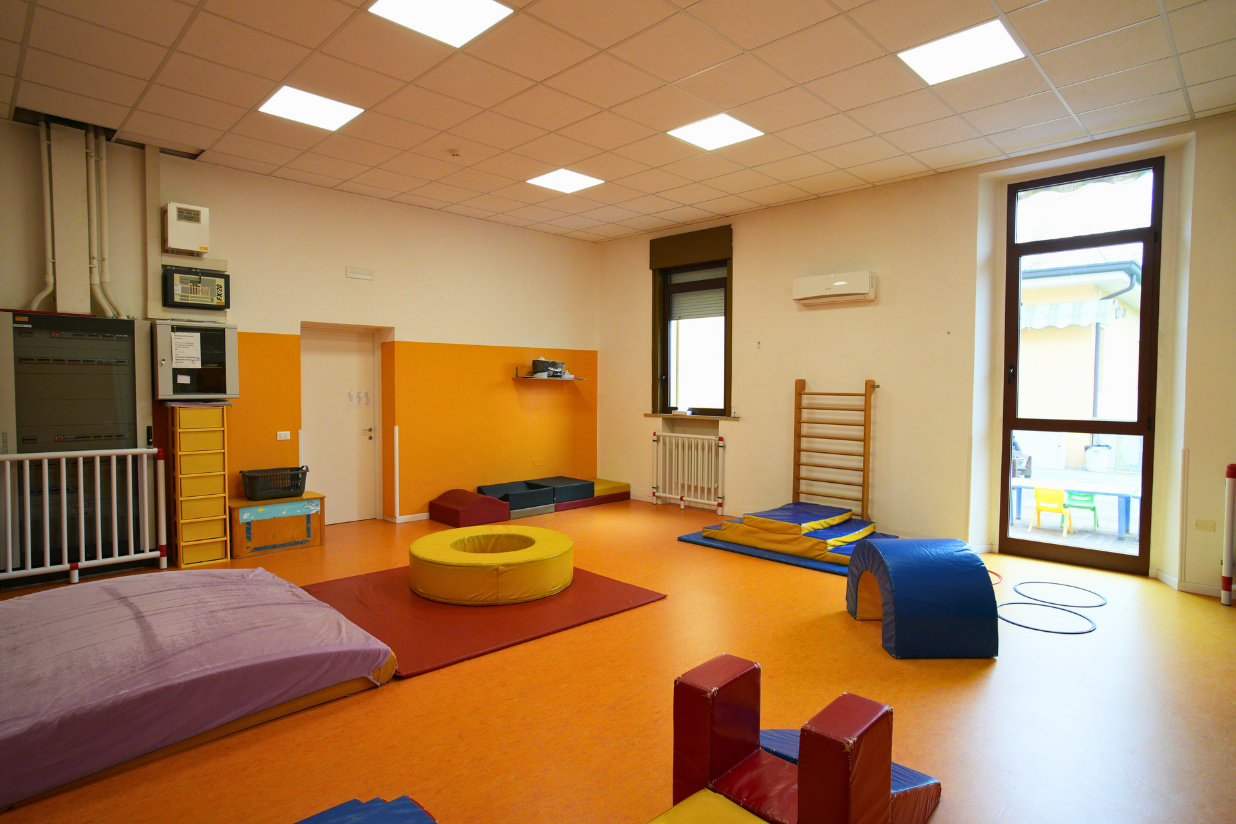 Le sezioni sono articolate in più ambienti, così da garantire una gestione funzionale della giornata al nido: stanza dedicata al gioco, area pranzo, bagno e spazio per il riposo. Sono inoltre presenti laboratori e palestra, a disposizione di tutti i bambini, per favorire esperienze diversificate e lo sviluppo motorio.