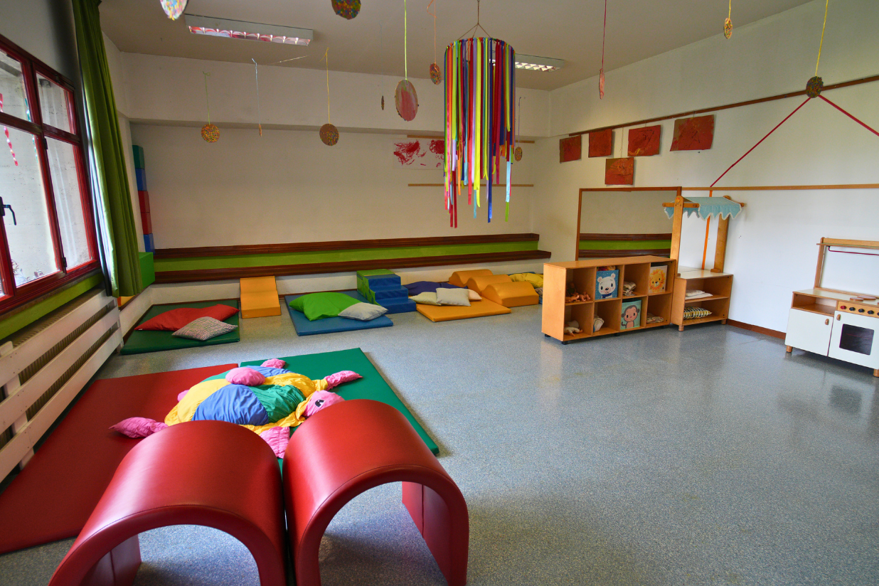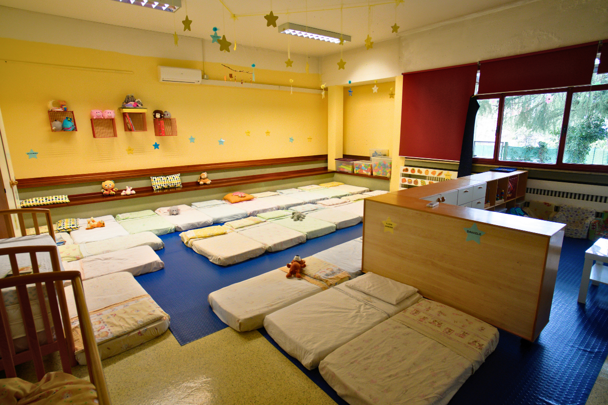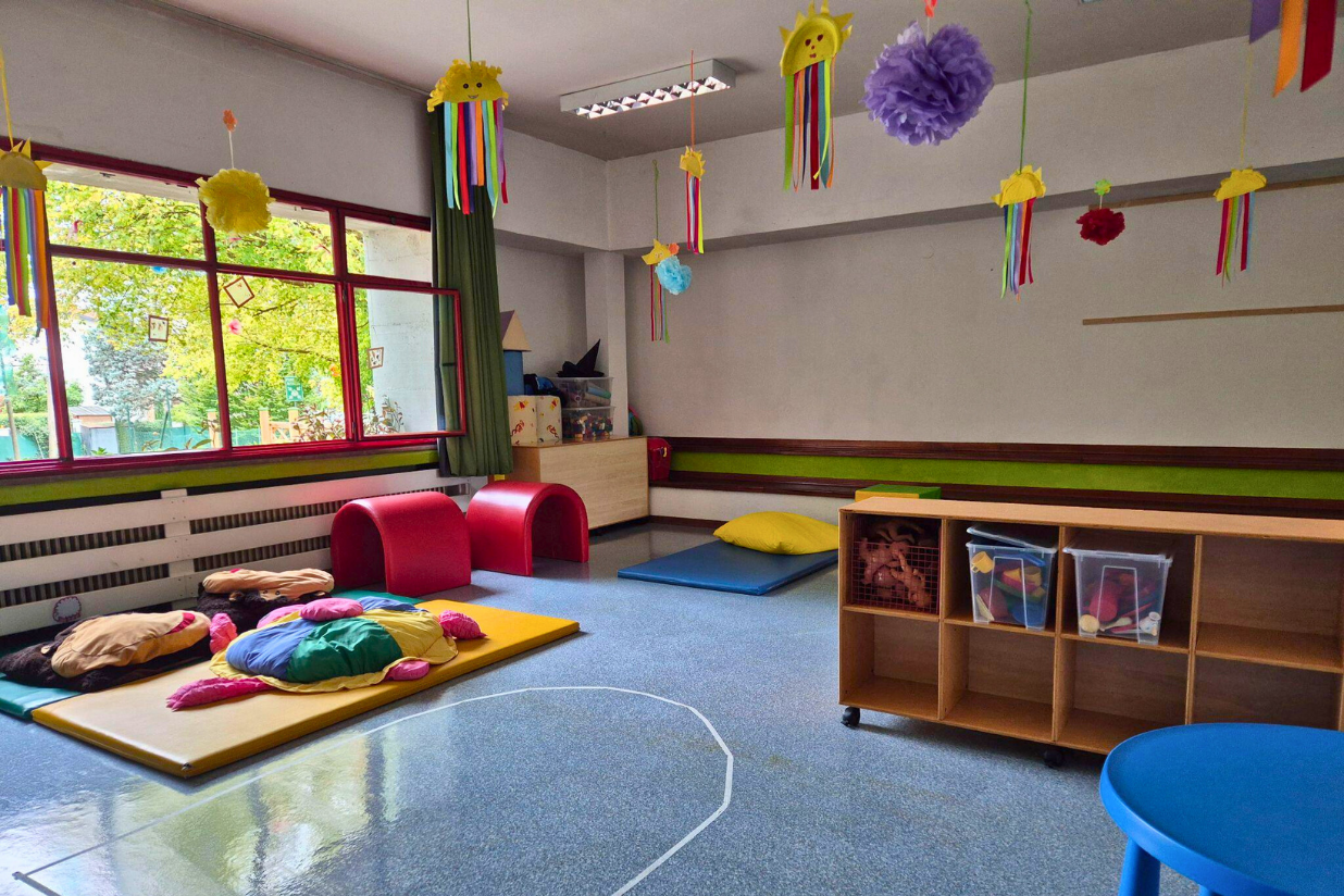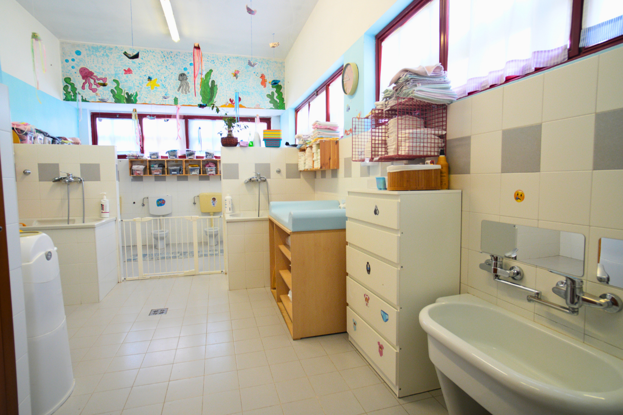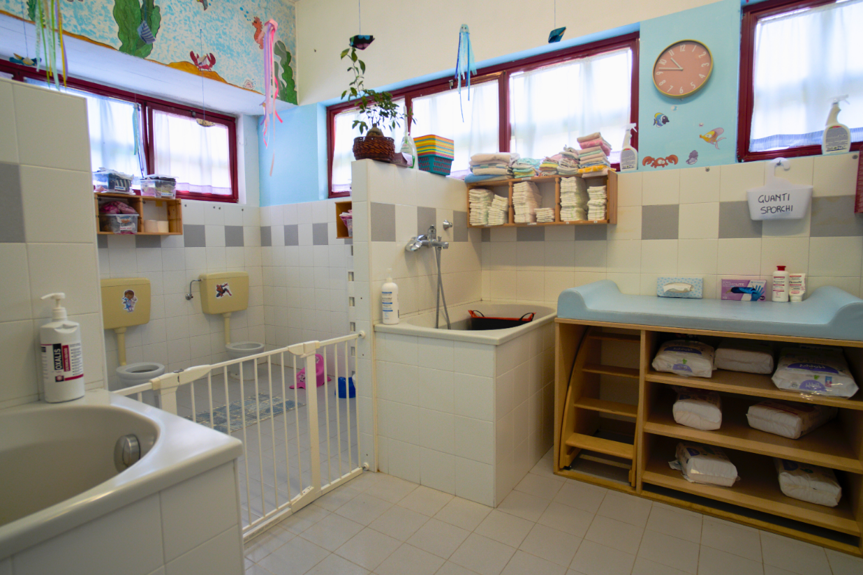 Gli spazi interni sono luminosi e organizzati per offrire molteplici opportunità di esplorazione e gioco, con aree dedicate alla cura e ad attività più strutturate. Il salone accoglie i bambini con angoli per il gioco simbolico, motorio, la lettura e la costruzione con materiali destrutturati. La stanza della creatività propone attività grafico-pittoriche e manipolative, mentre la sala da pranzo funge da “piazza” per socializzare e condividere momenti di gruppo. I luoghi di cura, come bagno e stanza nanna, garantiscono ritmi più lenti e spazi personalizzati.